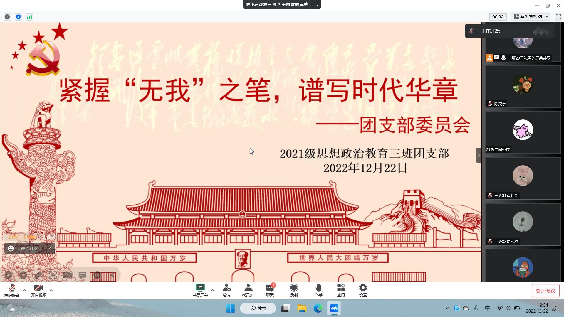 12月22日下午,金年会jinnianhuicom2021级思想政治教育三班在线上召开“紧握‘无我’之笔,谱写时代华章”团支部委员会。金年会jinnianhuicom2021级思想政治教育三班团支部委员会全体成员参与此次会议。会议由团支书王岚霄主持。