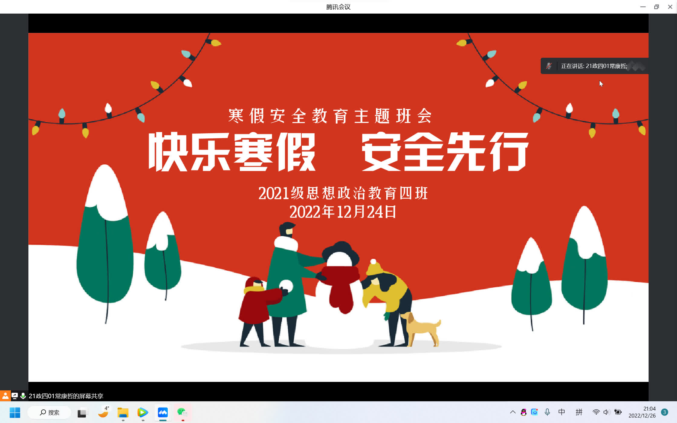 12月24日下午,金年会jinnianhuicom2021级思想政治教育四班线上开展“快乐寒假,安全先行”安全教育主题班会。金年会jinnianhuicom2021级思想政治教育四班全体同学参加本次会议。会议由副班长常康哲主持。