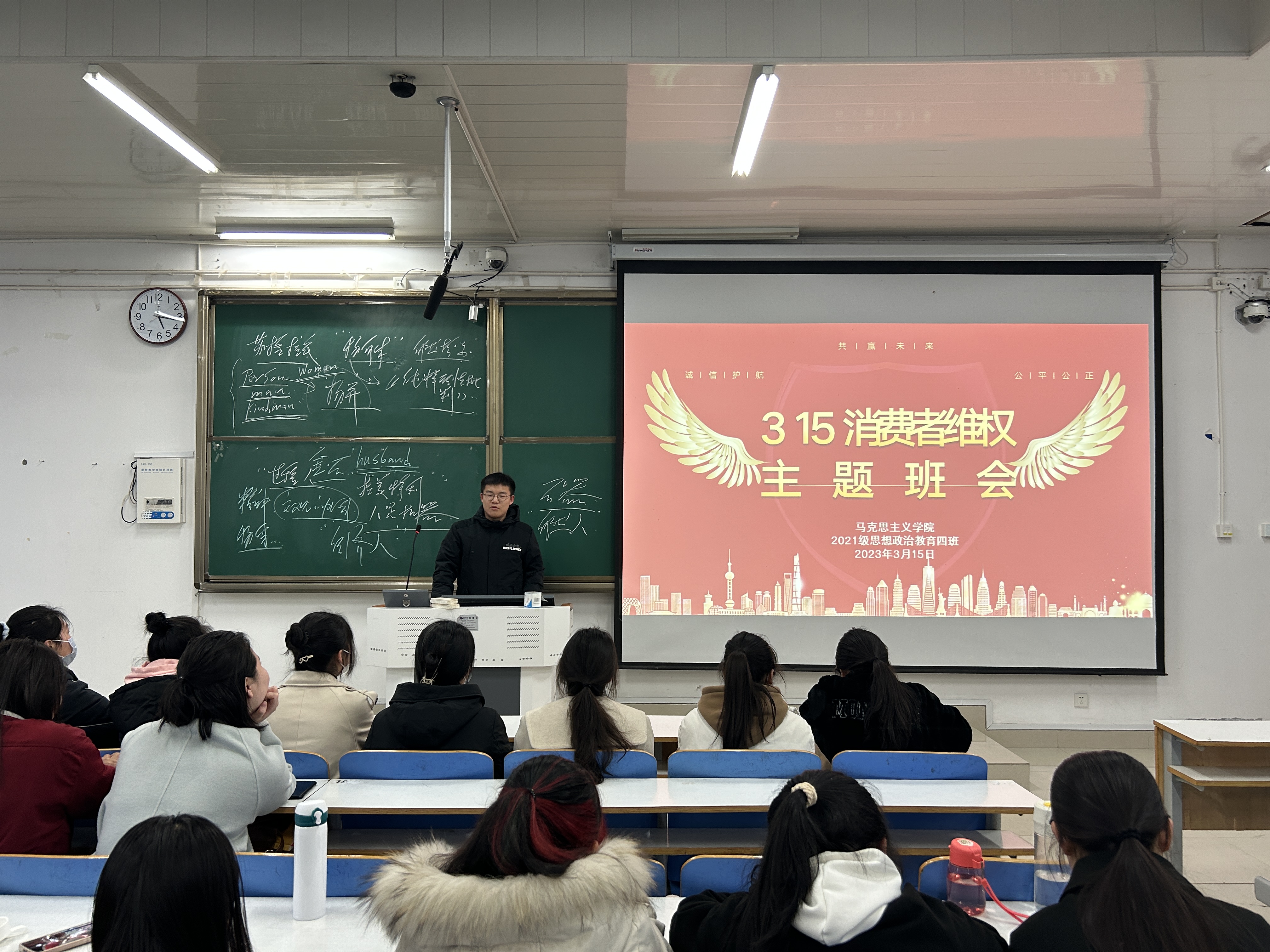为了扩大消费者权益保护的宣传,提高我班同学维权意识和能力,3月5日下午,金年会jinnianhuicom2021级思想政治教育四班在社科楼514教室开展“315消费者维权”主题班会。2021级思想政治教育四班全体成员共同参会,会议由副班长常康哲主持。