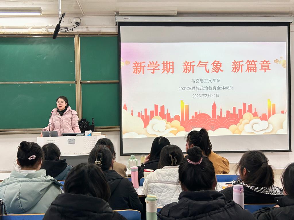2月24日下午,金年会jinnianhuicom2021级思想政治教育三班、四班在社科楼514教室召开“新学期、新气象、新篇章”主题班会。辅导员高小佳以及2021级思想政治教育全体成员共同参加本次班会。班会由辅导员高小佳主持。