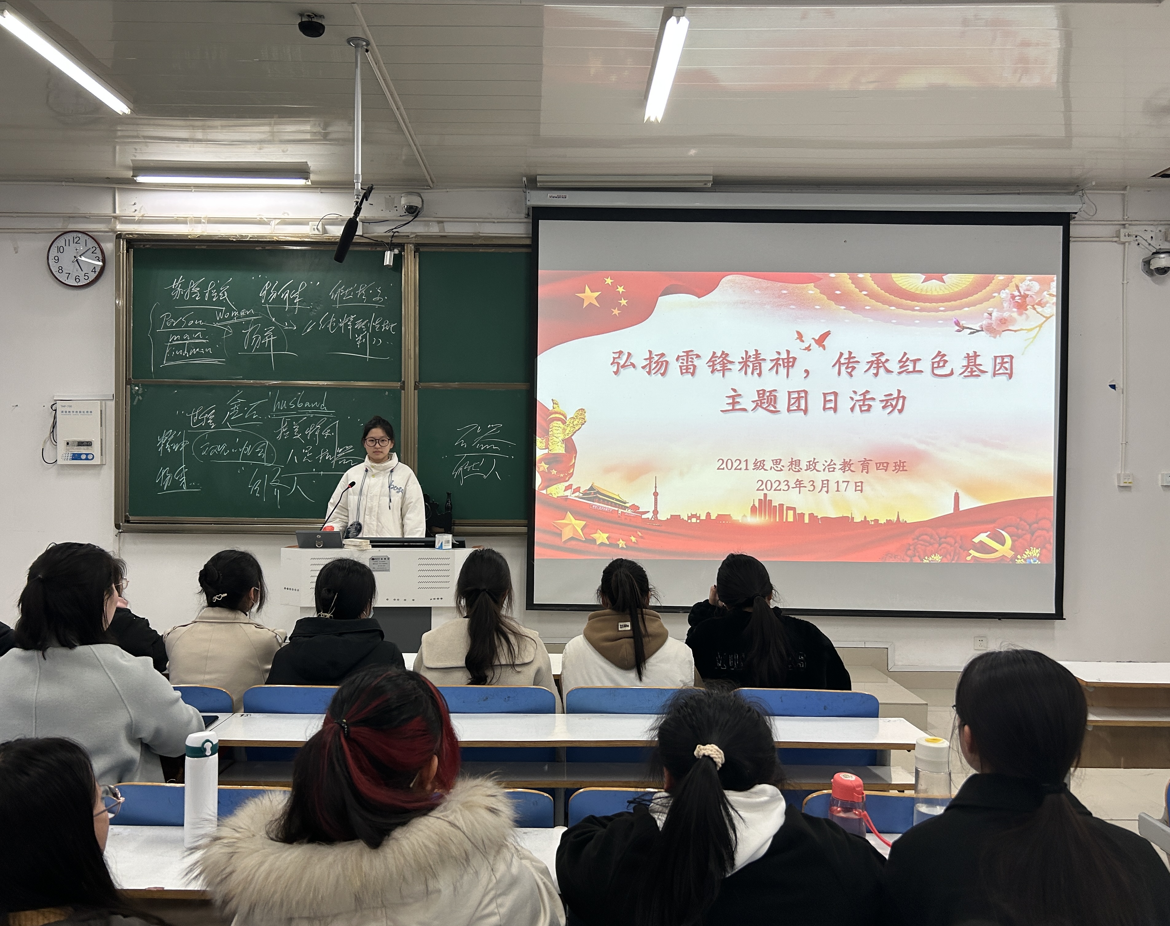 为大力弘扬雷锋精神,传承雷锋艰苦朴素的优良作风,3月17日下午,金年会jinnianhuicom2021级思想政治教育四班在社科楼514教室开展“弘扬雷锋精神,传承红色基因”主题团日活动。2021级思想政治教育四班全体成员共同参加本次活动,活动由团支书刘珂含主持。
