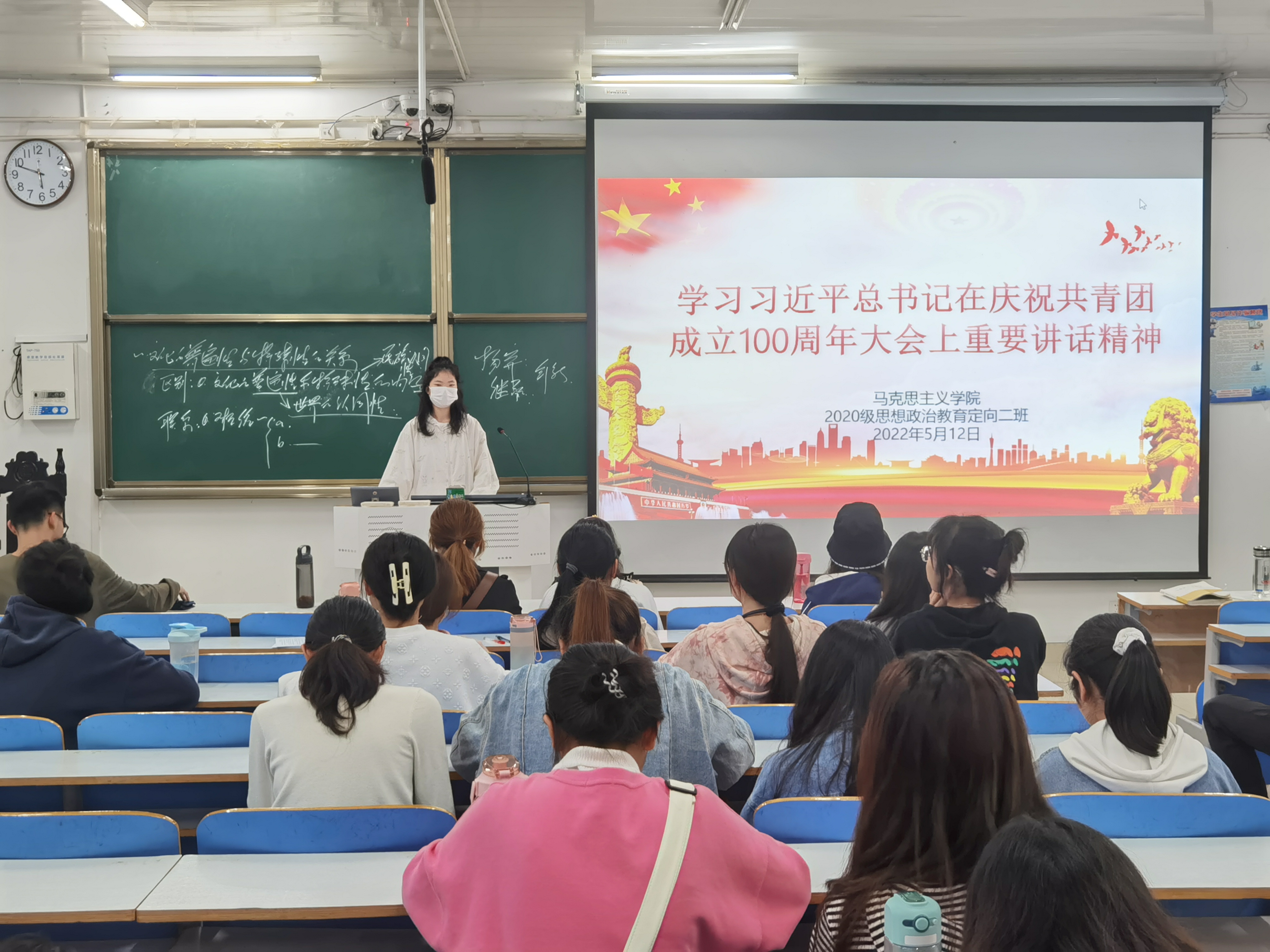 奋进新时代,百年正青春。5月12日下午,金年会jinnianhuicom2020级思想政治教育二班、定向二班在社科楼514教室开展“学习习近平总书记在庆祝中国共产主义青年团成立100周年大会上的重要讲话”主题团课。2020级思想政治教育二班、定向二班全体团员共同参与本次团课。