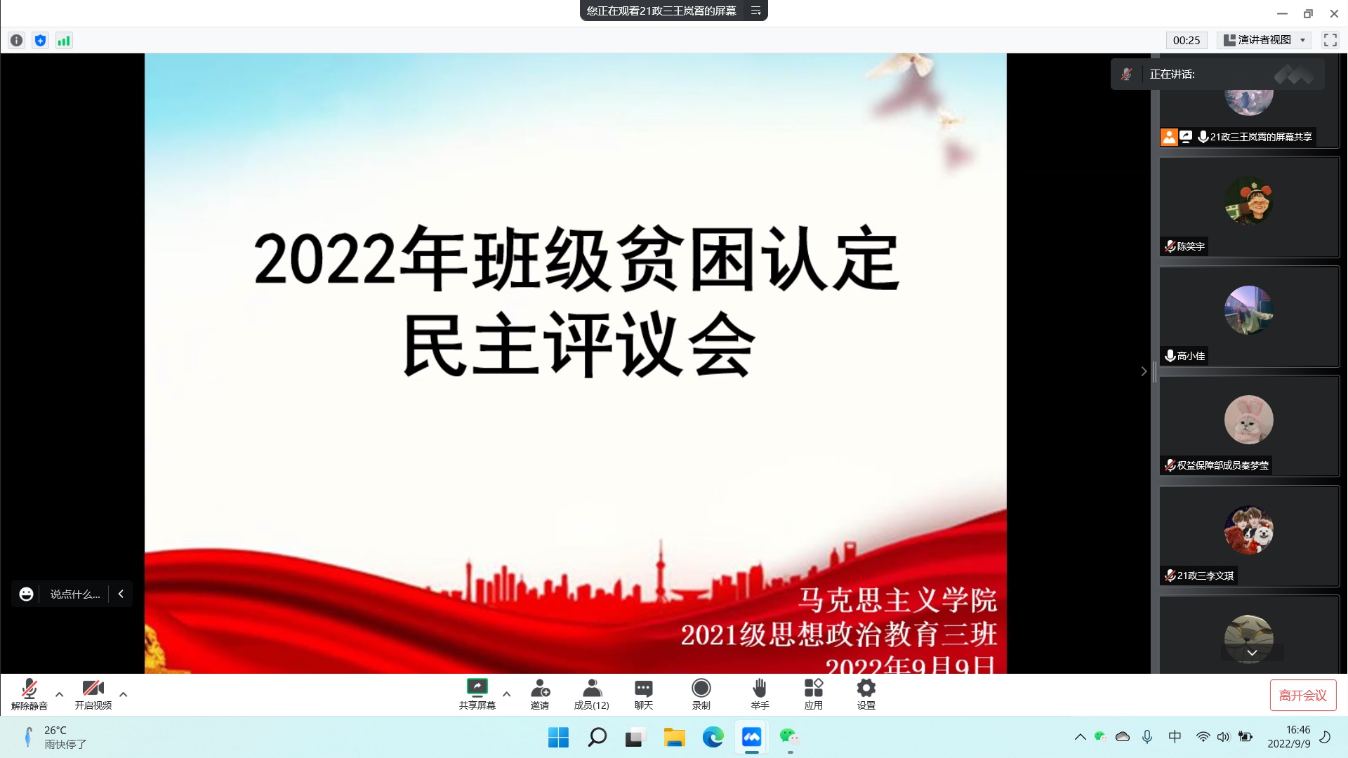 9月9日下午,金年会jinnianhuicom2021级思想政治教育三班召开线上2022年班级贫困认定民主评议会。2021级思想政治教育三班贫困认定委员团全体成员以及权益保障部秦梦莹、宣传委员陈笑宇参与此次会议。会议由团支书王岚霄主持。