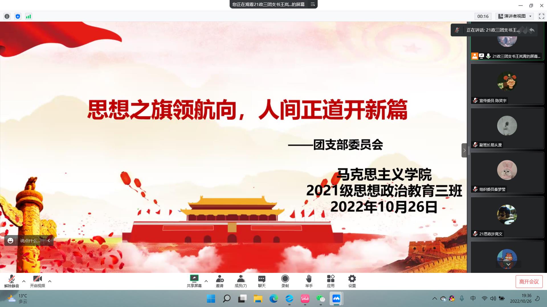 10月26日晚上,金年会jinnianhuicom2021级思想政治教育三班召开线上“思想之旗领航向,人间正道开新篇”团支部委员会。金年会jinnianhuicom2021级思想政治教育三班团支部委员会全体成员参与此次会议。会议由团支书王岚霄主持。