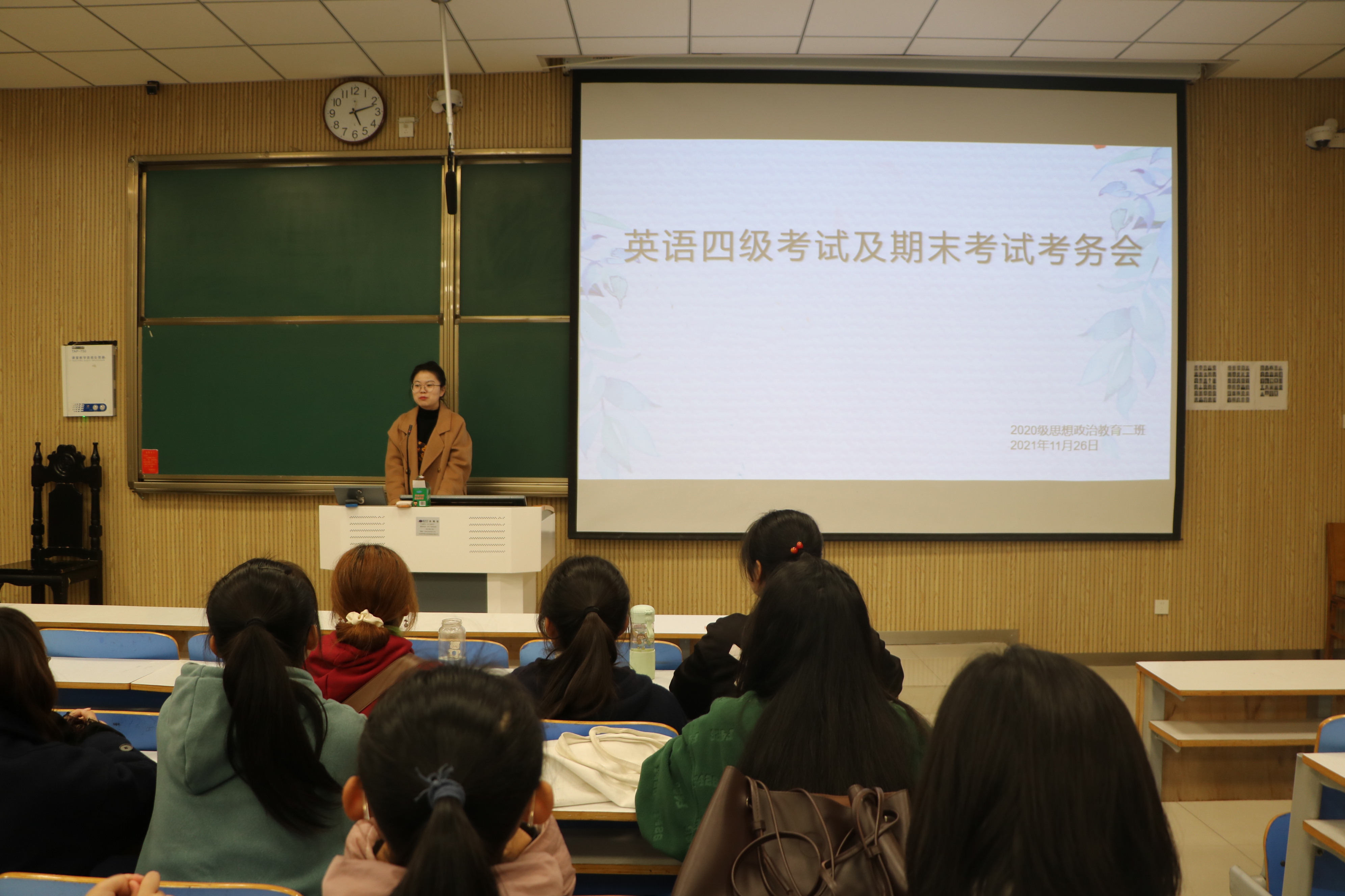 11月26日下午,金年会jinnianhuicom2020级思想政治教育二班、定向二班在社科楼515教室召开英语四级考试及期末考务会。2020级思想政治教育二班、定向二班全体师生共同参与本次会议。代理班主任高小佳主持会议并讲话。