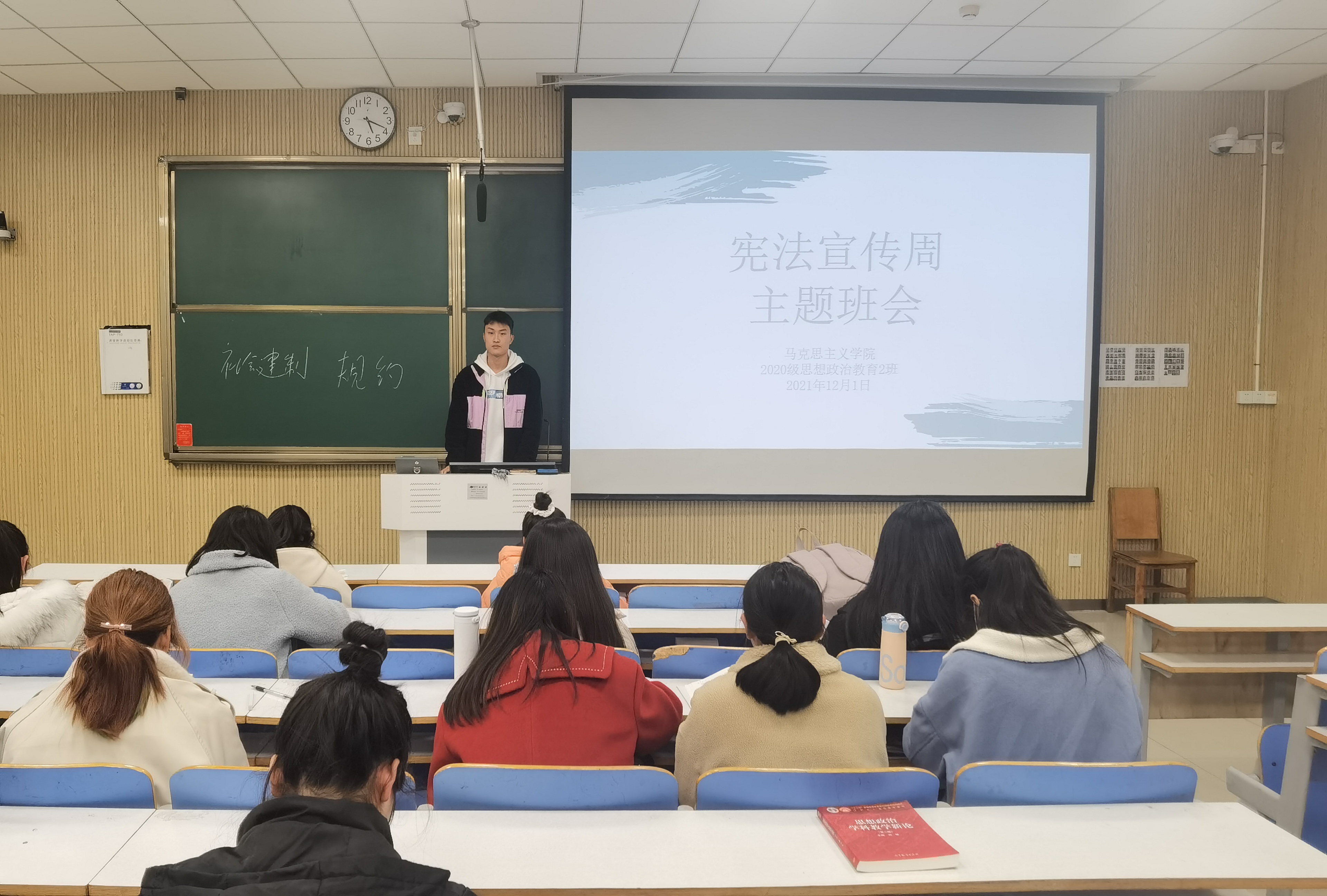 为深入落实金年会官网关于开展“宪法宣传周”工作的具体要求,提升我班同学法治素养,12月1日下午,金年会jinnianhuicom2020级思想政治教育二班、定向二班在社科楼515教室召开“宪法宣传周”主题班会。2020级思想政治教育二班、定向二班全体同学共同参与本次班会。会议由团支书陈宇航主持。