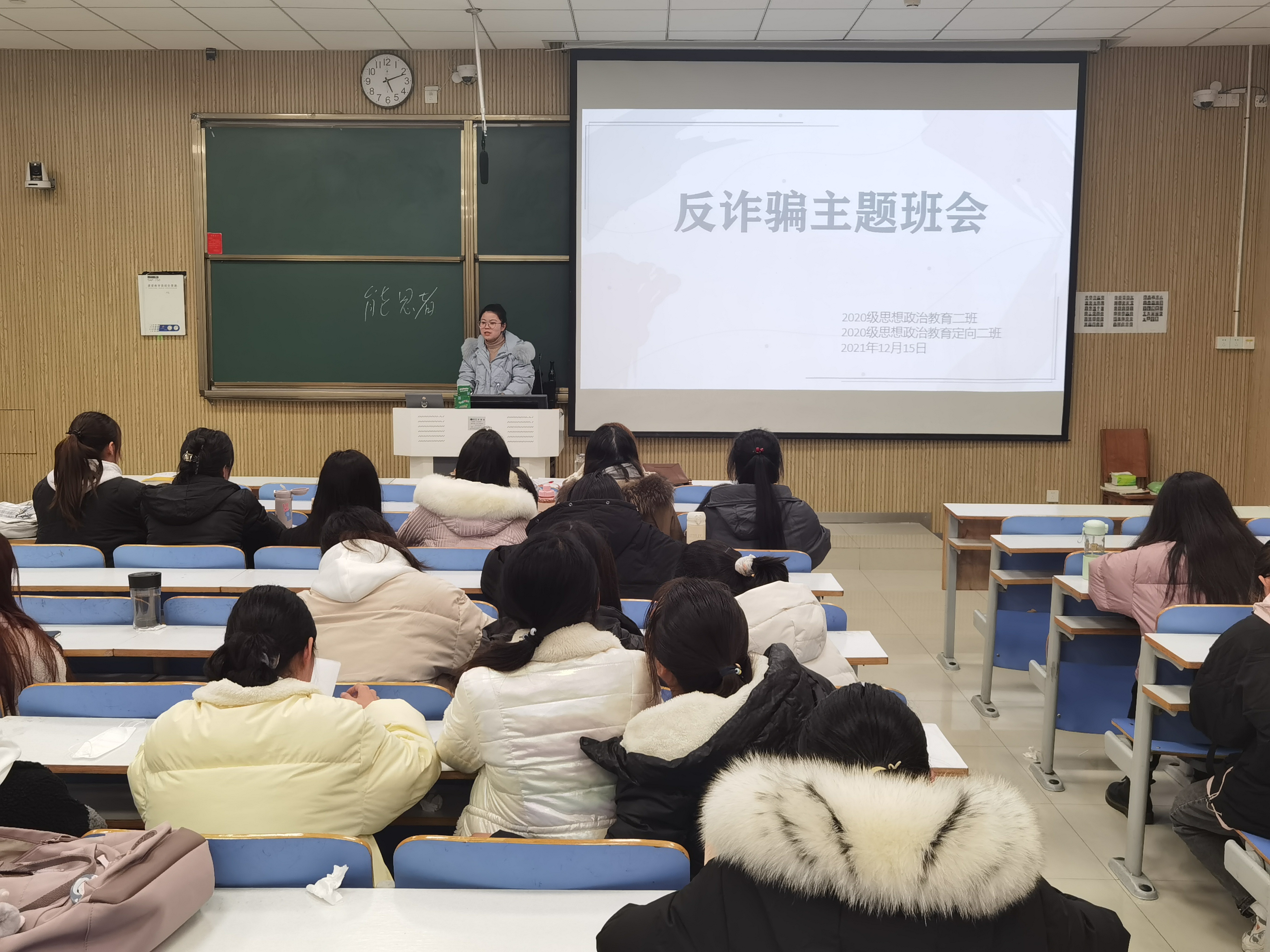 为提高学生的安全防范意识,切实保护学生的人身财产安全,12月15日下午,金年会jinnianhuicom2020级思想政治教育二班、定向二班在社科楼515教室召开“反诈骗”和“宿舍安全”教育主题班会。辅导员高小佳及2020级思想政治教育二班、定向二班全体同学共同参与本次班会。班会由辅导员高小佳主持。