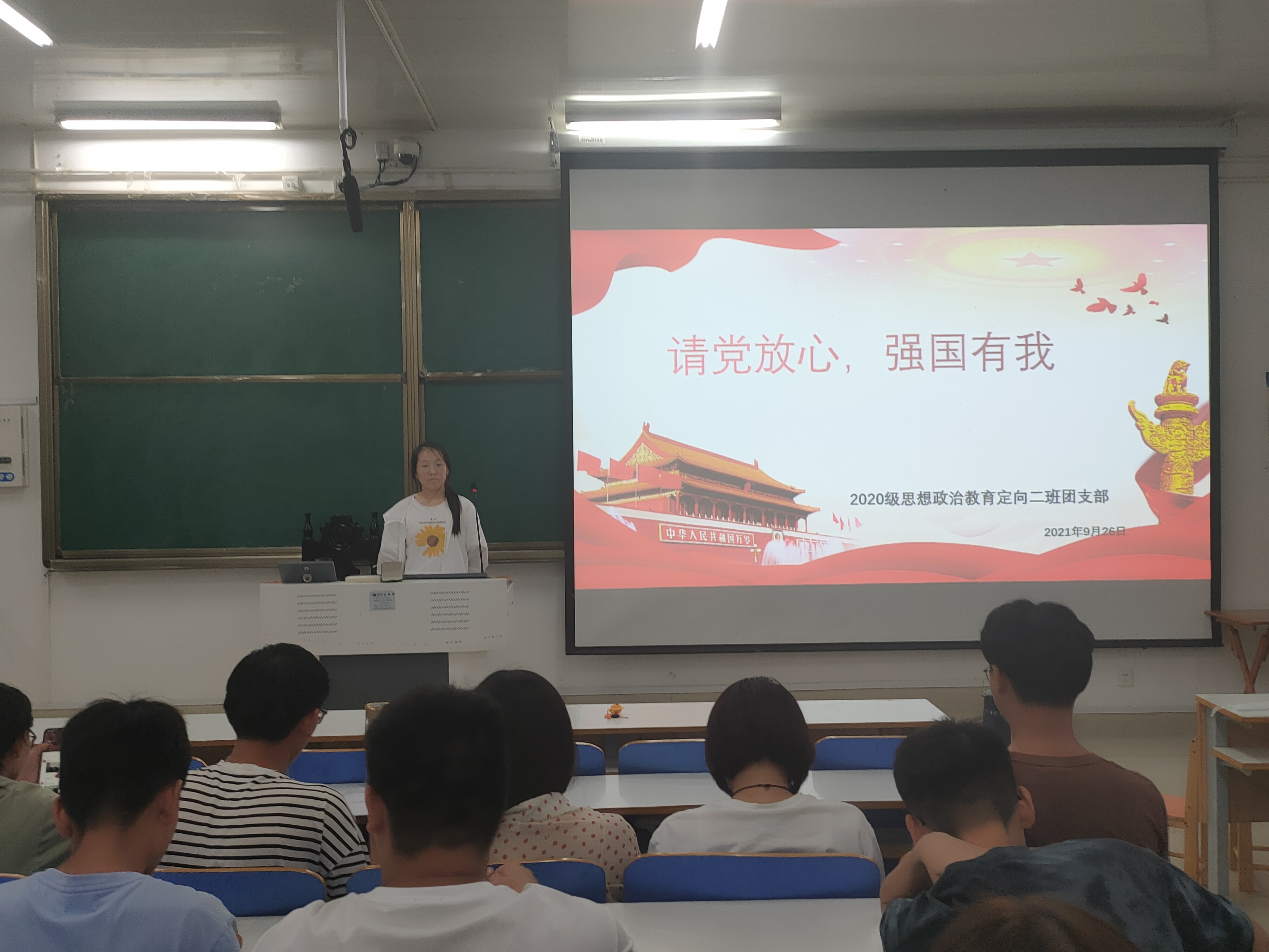 9月26日晚上,金年会jinnianhuicom2020级思想政治教育二班、定向二班在社科楼514教室顺利开展“请党放心,强国有我”主题团课。二班、定向二班全体团员共同参加本次团课,团课由孙晶晶、黄敏主持。
