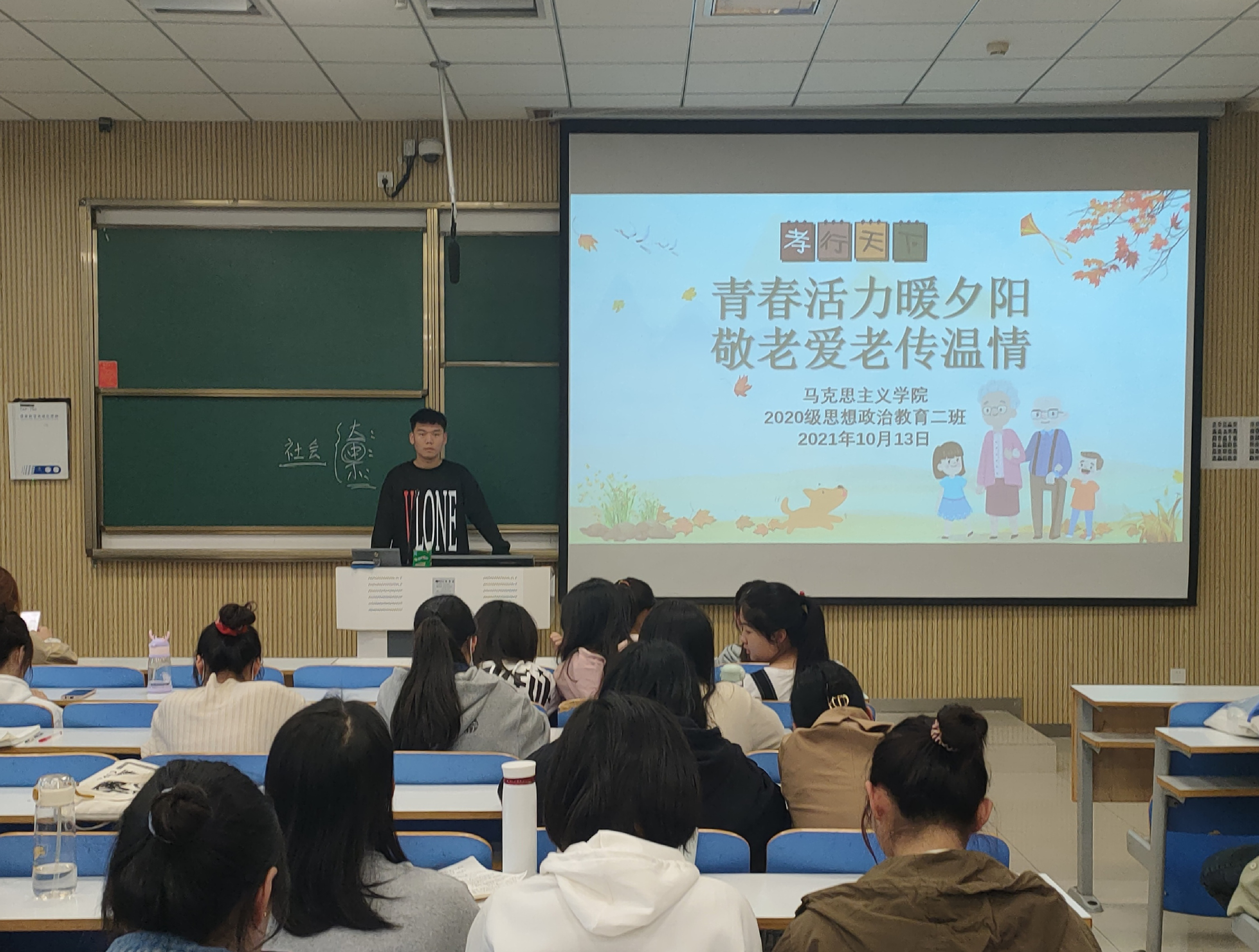 为弘扬孝老敬老的中华传统美德,10月13日下午,金年会jinnianhuicom2020级思想政治教育二班、定向二班“青春活力暖夕阳,敬老爱老传温情”主题团课在社科楼515教室顺利开展。二班、定向二班全体团员共同参与本次团课。团课由程歌讲授。