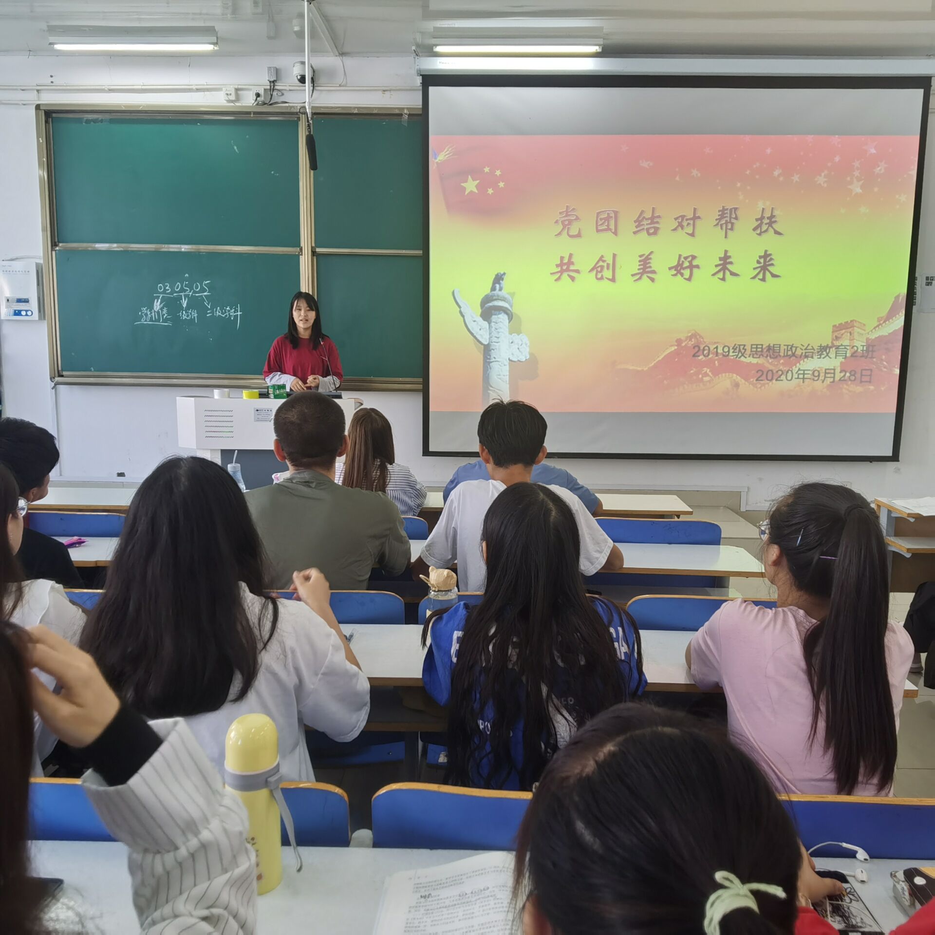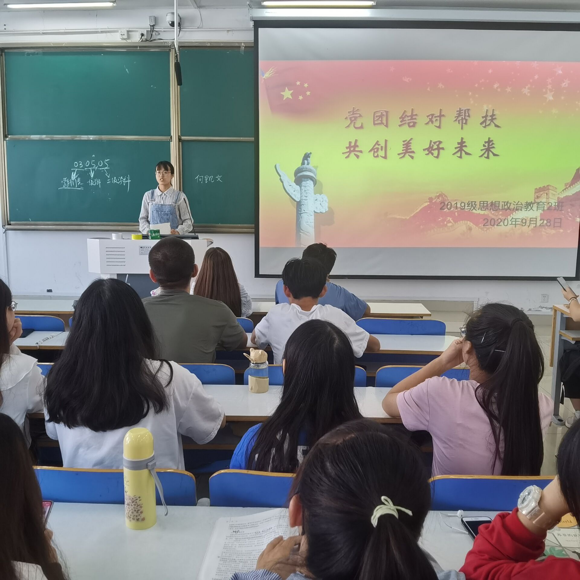 9月28日上午,金年会jinnianhuicom2019级思想政治教育二班在社科楼516教室召开了“党团结对帮扶,共创美好未来”主题会议。金年会官网预备党员张晓艳、王文芳及2019级思想政治教育二班全体成员共同参会。会议由团支书孙雅娴主持。