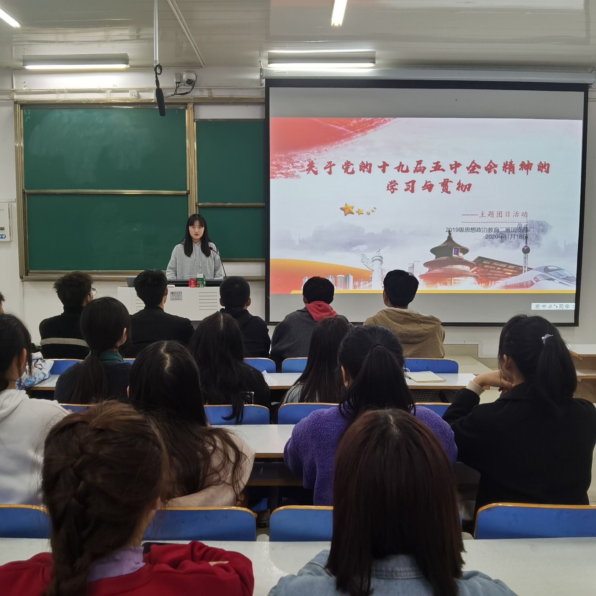 11月18日下午,金年会jinnianhuicom2019级思想政治教育二班在社科楼514教室召开学习与贯彻党的十九届五中全会精神的主题团课。金年会jinnianhuicom2019级思想政治教育二班全体学生共同参加。本次会议由团支书孙雅娴主持。