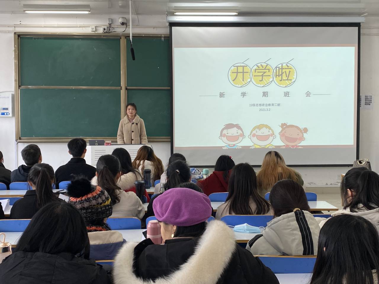 首先,陶青青向同学们致以诚挚的新春祝福并对新同学加入思想政治教育二班这个大家庭表示热烈欢迎。接着,陶青青强调同学们应时刻绷紧疫情防控这根线,秉持“非必要、不出校”的原则对自身安全切实负责。随后,部分同学们畅谈寒假见闻,积极分享自己参与社会实践、社会志愿公益活动的感悟,陶青青就同学们爱学习、思进取的思想状态表示赞赏。新学期伊始,陶青青向同学们提出几点要求:一要自我调整,心回学校。同学们应对作息时间做出调整,确保有充沛的精力开始新学期的学习生活。二要奋发学习,勤学善思。每个同学都要有新计划和新目标,要勤奋学习,善于思考,不断提高自身观察问题、解决问题的能力。三要学有目标,心有榜样。希望同学们能找到心中的榜样,向他们学习、看齐,努力成为有知识、有道德、有作为的新时代建设者和接班人。最后,各班委对上学期工作作出总结,针对班级管理中暴露出的短板和不足,及时反思,汲取经验,共建积极向上的班集体。