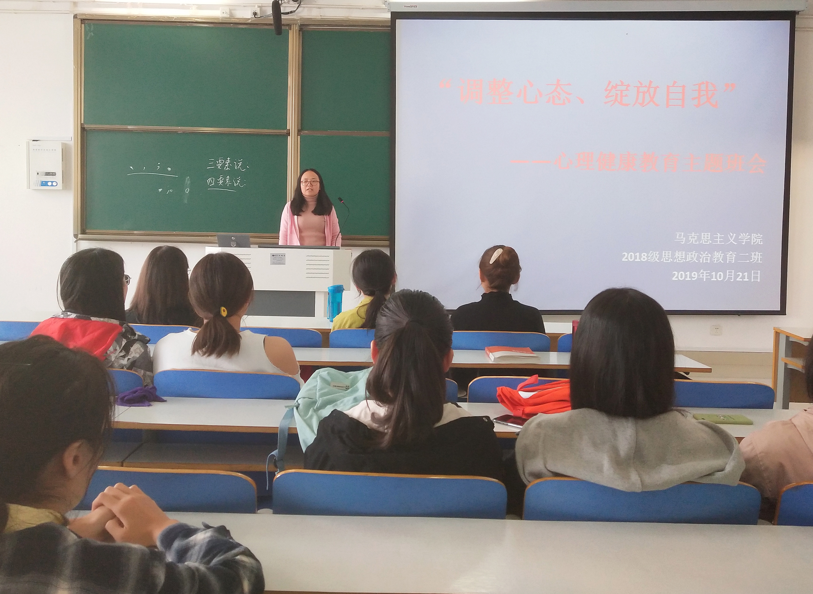 为进一步提高同学们的心理调节能力,保持良好的心理状态,10月21日上午,金年会官网2018级思想政治教育二班于社科楼516教室顺利开展“调整心态,绽放自我”心理健康教育主题班会。我班邀请辅导员曹菁菁前来参加本次班会。班会由心理委员席妞主持。