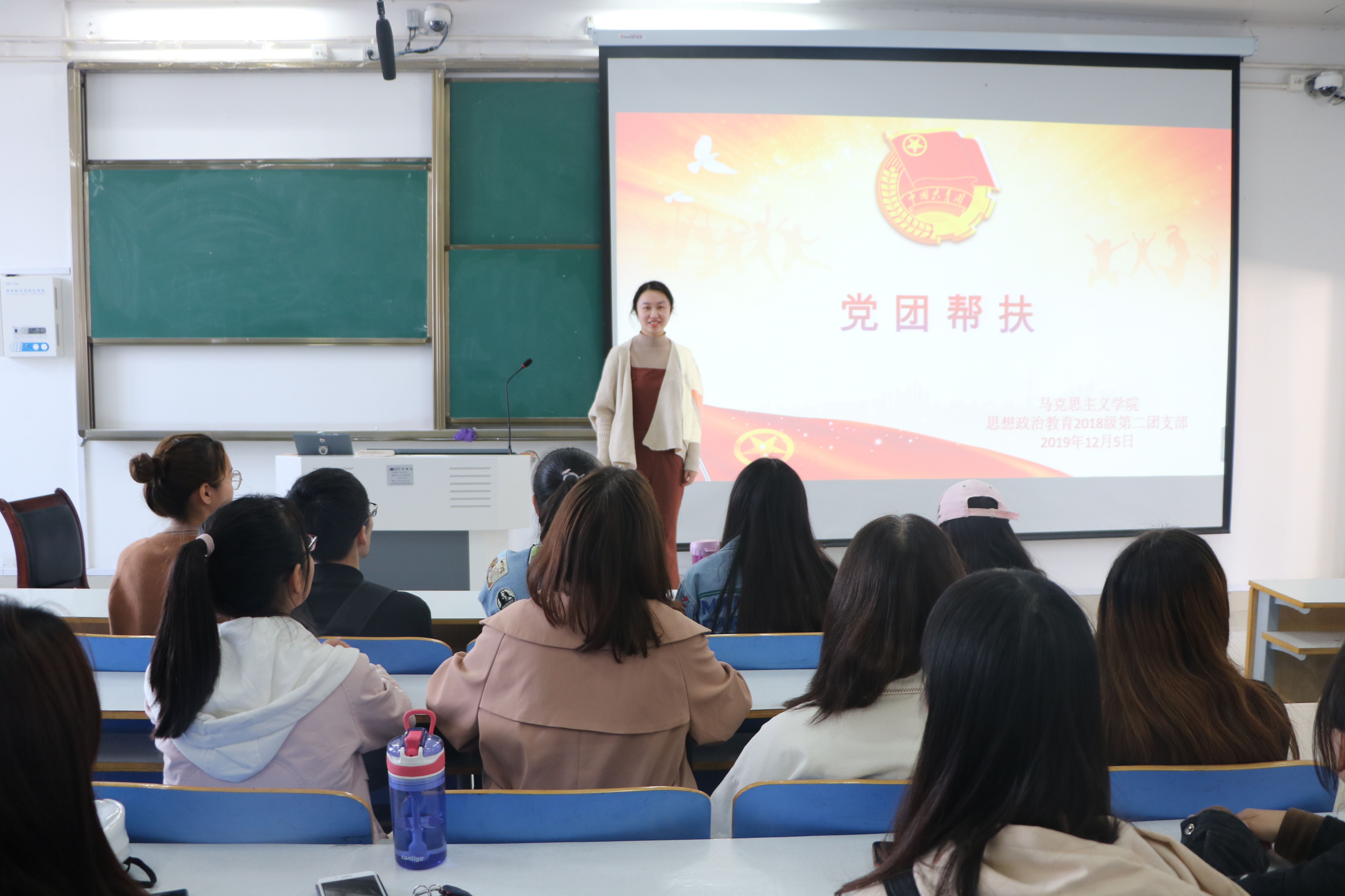 12月5日上午,金年会官网2018级思想政治教育二班于社科楼514教室顺利开展了党团帮扶活动。我班邀请学生党员代表李媛前来参加本次交流活动。活动由团支书黄子晋主持。