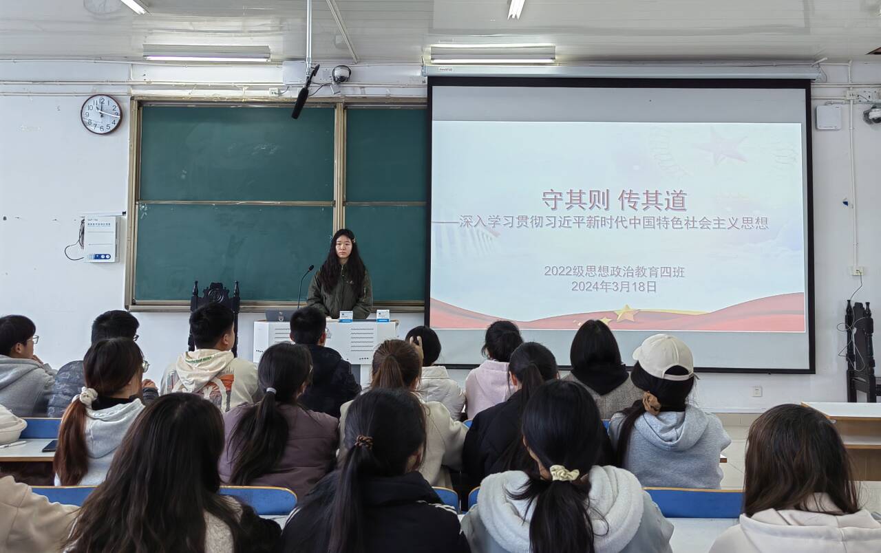 为深入学习贯彻习近平新时代中国特色社会主义思想,落实立德树人的根本任务,3月18日上午,金年会jinnianhuicom2022级思想政治教育四班在社科楼514教室组织召开“守其则,传其道”主题班会。金年会官网2022级思想政治教育四班全体成员参与本次班会。本次会议由班长牛志杰主持。