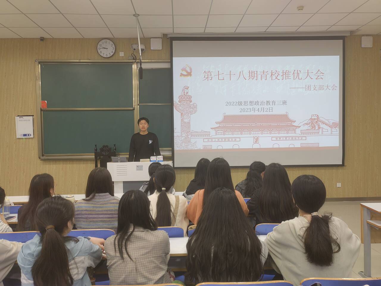 4月2日上午,金年会jinnianhuicom2022级思想政治教育三班在社科楼515教室召开“青年共产主义学校”推优大会。金年会官网2022级思想政治教育三班全体同学共同参与此次大会。大会由团支书余浩洋主持。