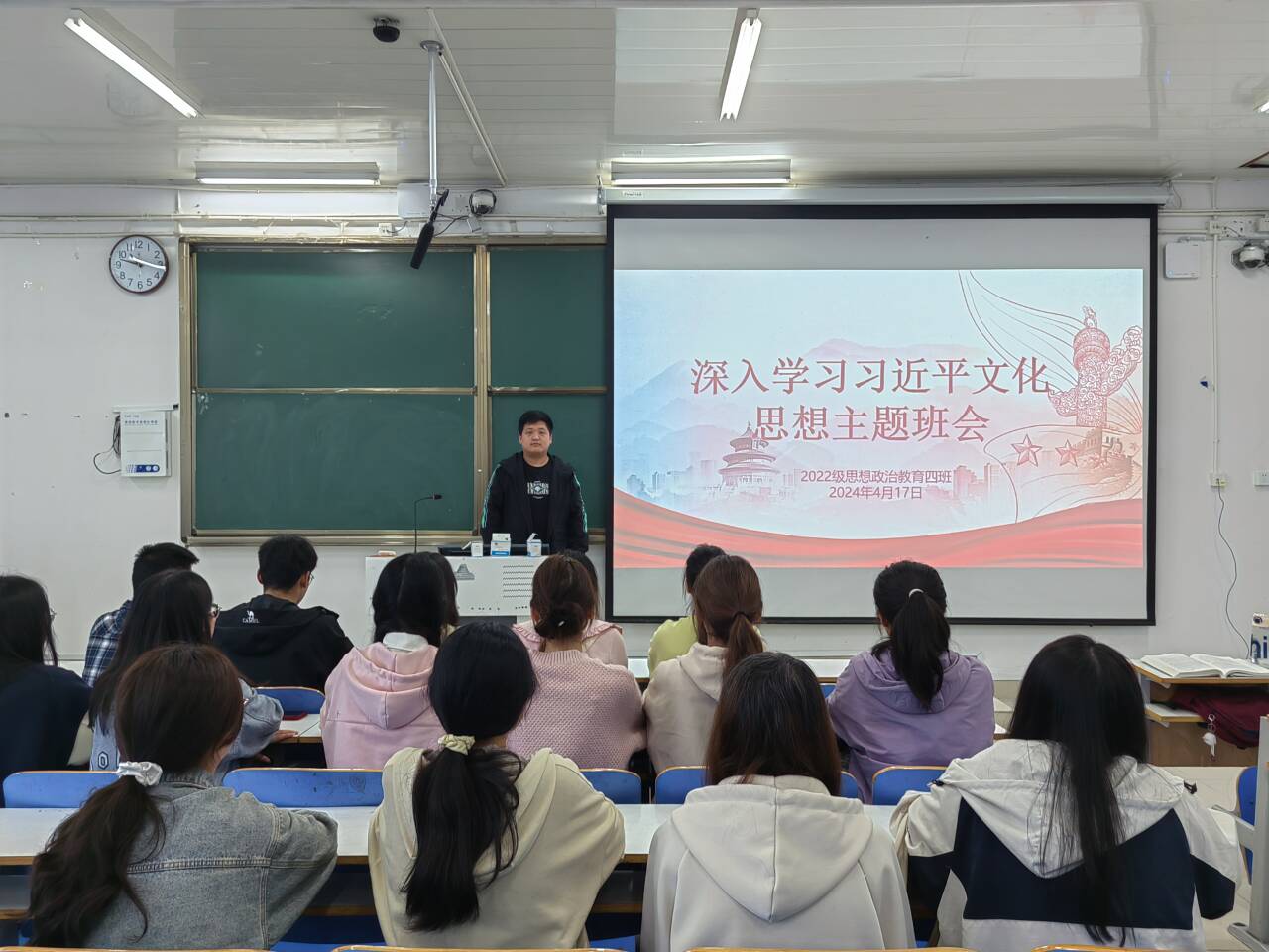 为深入学习贯彻习近平文化思想,引导广大青年学子勇担强国使命,矢志文化报国,4月17日上午,金年会jinnianhuicom2022级思想政治教育四班在社科楼514教室组织召开“深入学习习近平文化思想”主题班会。金年会官网2022级思想政治教育四班全体成员参与本次班会。本次班会由副班长宋奕铭主持。