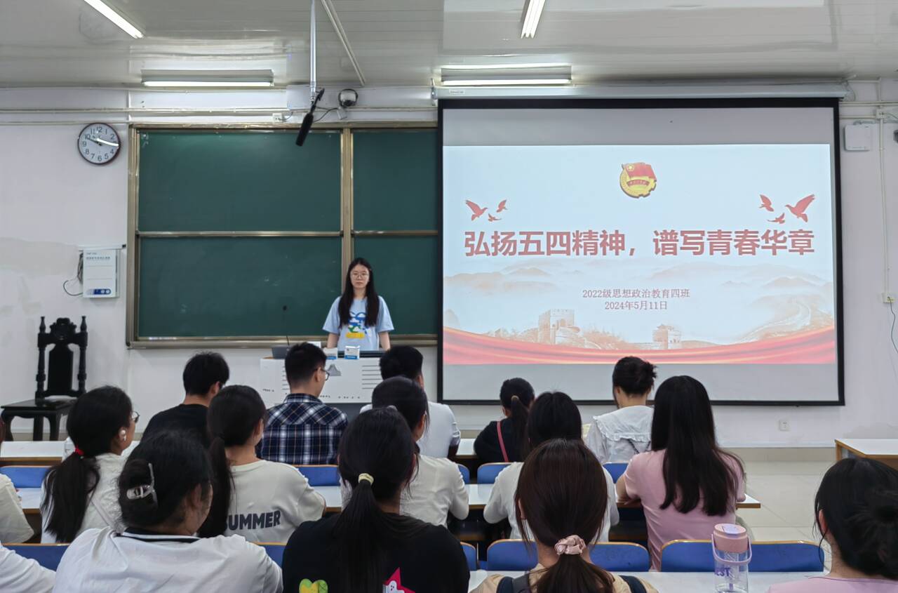 5月11日上午,金年会jinnianhuicom2022级思想政治教育四班在社科楼514教室组织召开“弘扬五四精神,谱写青春华章”主题团课。金年会官网2022级思想政治教育四班全体成员参与本次团课。本次团课由团支书牛志杰主持。