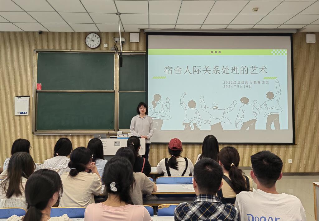 为进一步提高学生的心理健康水平,优化学生的心理素质,引导广大学生关爱自我的心理健康,5月10日上午,金年会jinnianhuicom2022级思想政治教育四班在社科楼515教室组织召开“宿舍人际关系处理的艺术”心理班会。金年会官网2022级思想政治教育四班全体成员参与本次班会。本次班会由心理委员徐成若主持。