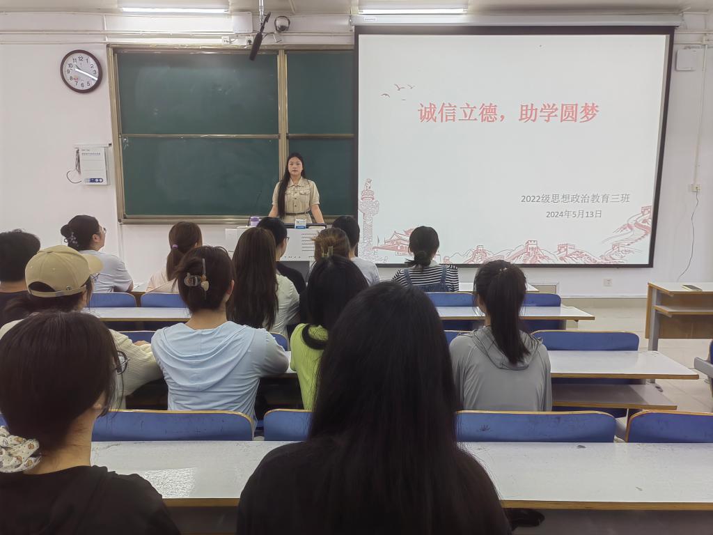 为落实立德树人根本任务,增强广大青年学生的诚信意识和责任意识,加大资助育人力度,5月13日上午,金年会jinnianhuicom2022级思想政治教育三班在社科楼514教室召开“诚信立德,助学圆梦”主题班会。金年会官网2022级思想政治教育三班全体成员共同参与此次班会。班会由副班长雷露露主持。