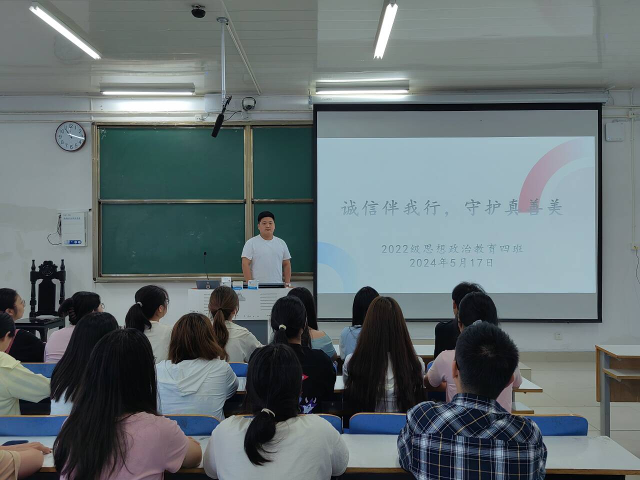 为进一步加强学生道德修养,增强学生诚信意识,在校园形成讲诚信、树诚信、践诚信的良好风气,5月17日上午,金年会jinnianhuicom2022级思想政治教育四班在社科楼514教室组织召开“诚信伴我行,守护真善美”主题班会。金年会官网2022级思想政治教育四班全体成员参与本次班会。本次团课由副班长宋奕铭主持。