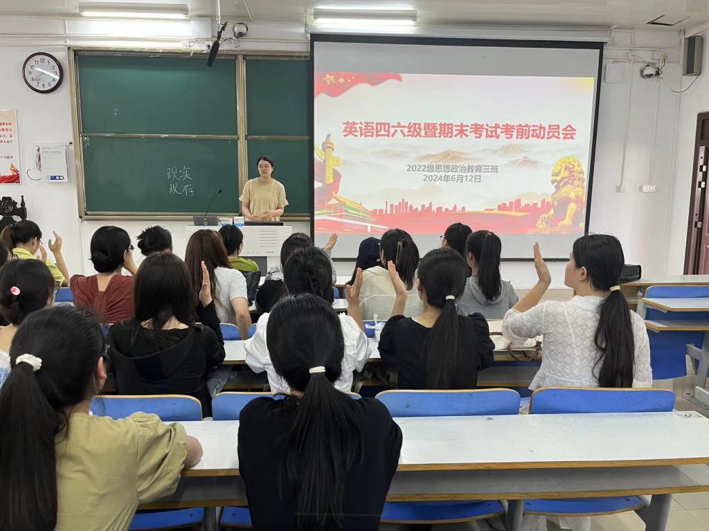 为进一步缓解同学们的学习压力,激发拼搏动力,6月12日上午,金年会jinnianhuicom2022级思想政治教育三班在社科楼514教室召开英语四六级暨期末考试考前动员会。金年会官网2022级思想政治教育三班班主任吴梦云和三班全体成员共同参与此次班会,班会由班主任吴梦云主持。