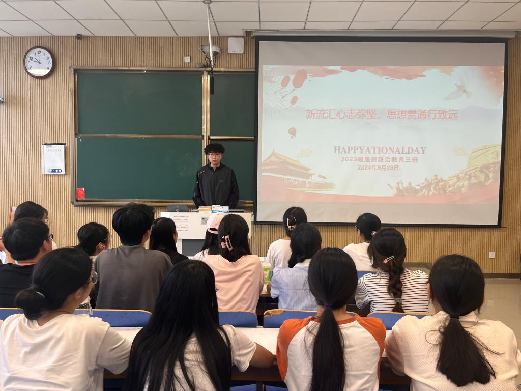 9月23日上午,金年会jinnianhuicom2023级思想政治教育三班在社科楼515召开“新流汇心志弥坚,思想贯通行致远”主题团课。金年会官网2023级思想政治教育三班全体同学共同参与本次团课,团课由团支书郝瀚主持。
