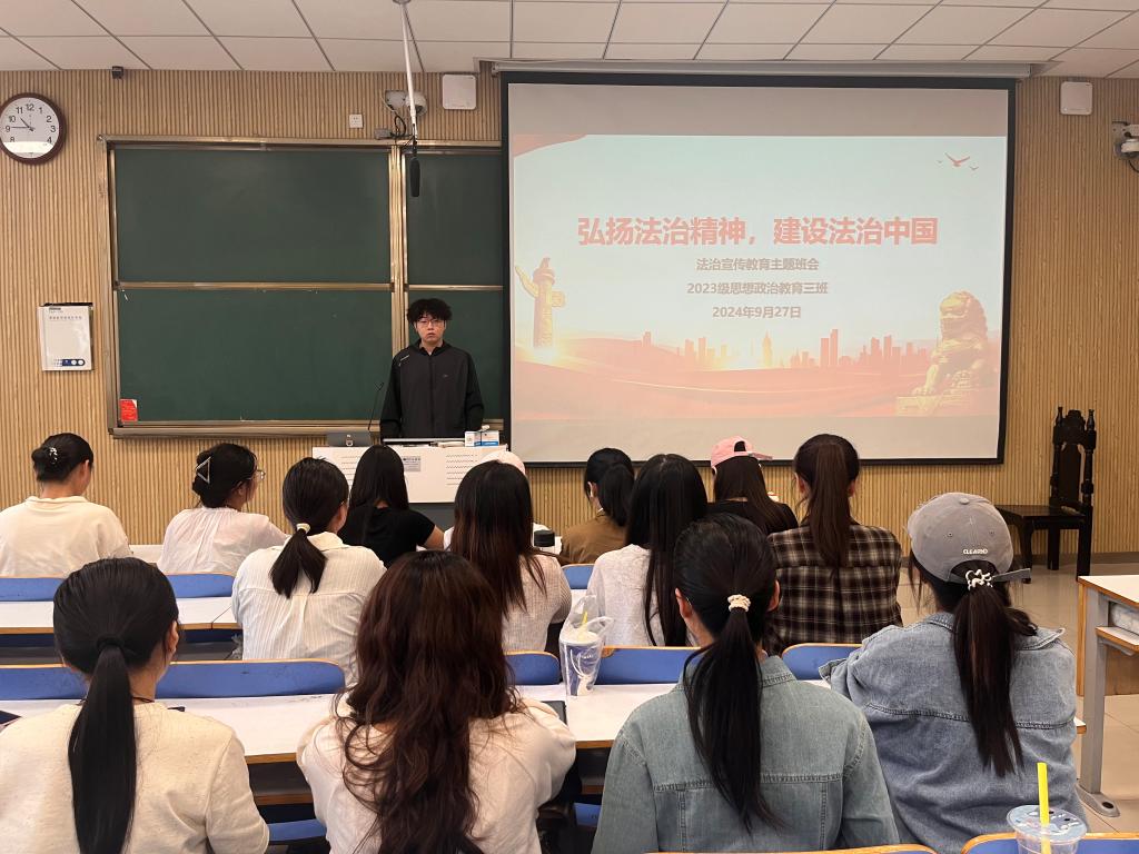9月27日上午,金年会jinnianhuicom2023级思想政治教育三班在社科楼515召开“弘扬法治精神,建设法治中国”主题班会。金年会官网2023级思想政治教育三班全体同学共同参与本次班会,班会由团支书郝瀚主持。