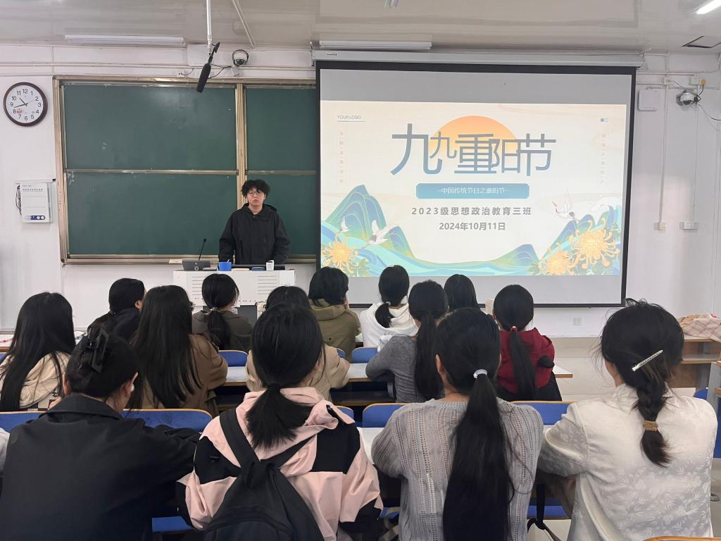 10月11日上午,金年会jinnianhuicom2023级思想政治教育三班在社科楼515召开“九九重阳节”主题班会。金年会官网2023级思想政治教育三班全体同学共同参与本次班会,班会由团支书郝瀚主持。