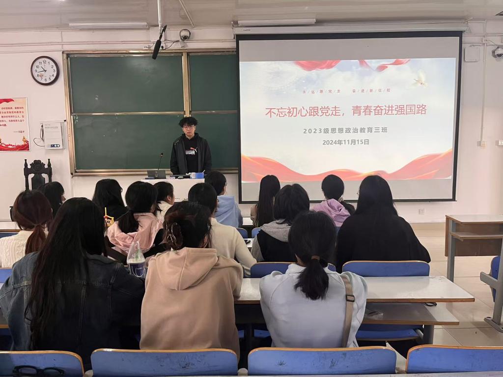 11月15日上午,金年会jinnianhuicom2023级思想政治教育三班在社科楼515召开“不忘初心跟党走,青春奋进强国路”主题团课。金年会官网2023级思想政治教育三班全体同学共同参与本次团课,团课由团支书郝瀚主持。