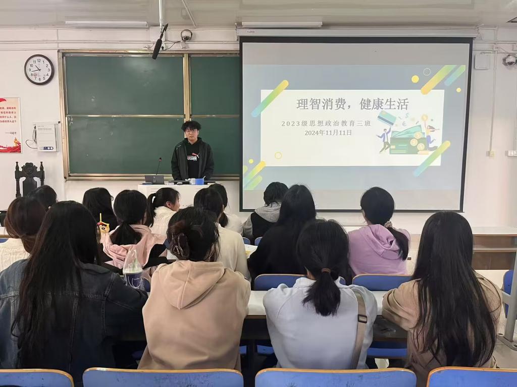 为帮助学生树立正确的消费观,11月11日上午,金年会jinnianhuicom2023级思想政治教育三班在社科楼515召开“理智消费,健康生活”主题班会。金年会官网2023级思想政治教育三班全体同学共同参与本次班会,班会由团支书郝瀚主持。