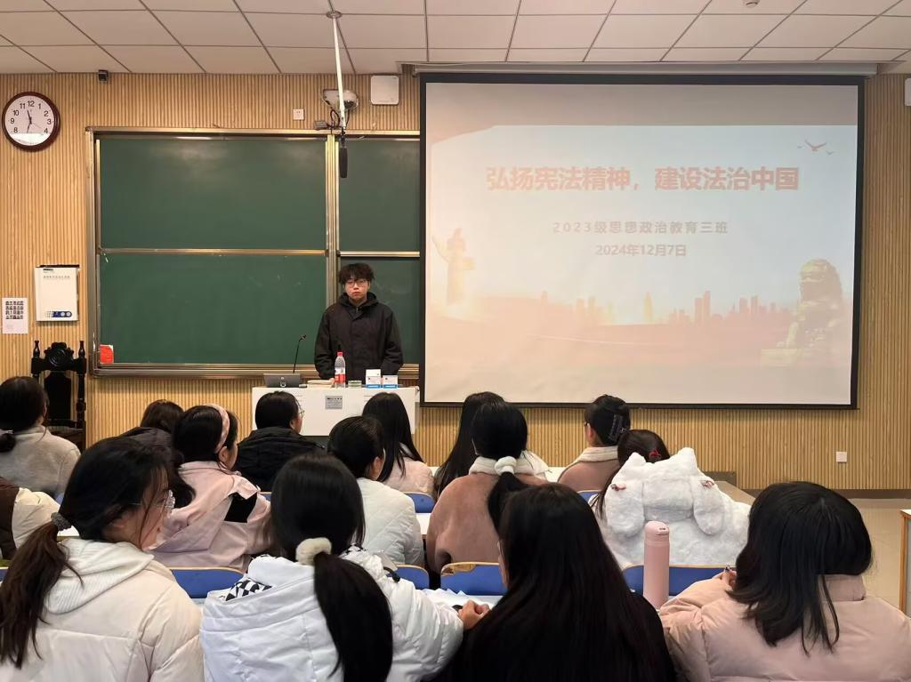 为弘扬宪法精神,推进全面依法治国,12月7日上午,金年会jinnianhuicom2023级思想政治教育三班在社科楼515召开“弘扬宪法精神,建设法治中国”主题团课。金年会官网2023级思想政治教育三班全体同学共同参与本次团课,团课由团支书郝瀚主持。