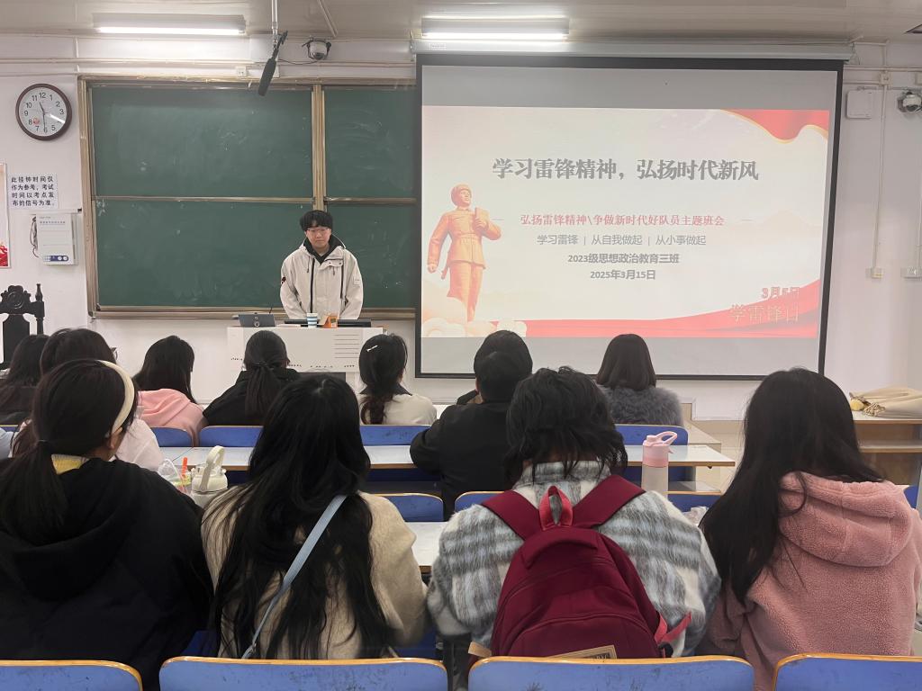 3月15日上午,金年会jinnianhuicom2023级思想政治教育三班在社科楼515召开“学习雷锋精神,弘扬时代新风”主题团课。金年会官网2023级思想政治教育三班全体同学共同参与本次团课,团课由团支书郝瀚主持。