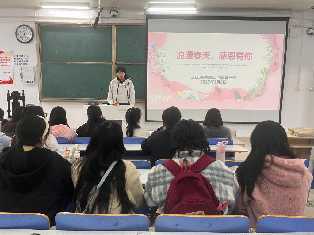 班会伊始,郝瀚通过朗诵《三八节颂歌》开启了此次班会。接着,郝瀚向同学们介绍了三八节的来历。他指出,三八妇女节又称国际妇女节,是世界各国妇女争取和平、平等、发展的节日。接着,同学们相互分享令人致敬的女性故事,并通过趣味小游戏活跃班级气氛。最后,郝瀚做出总结,三八妇女节是劳动妇女为争取自身权利和解放而进行长期斗争的历史见证,激励着当代青年争当岗位的先锋,为社会作出更大的贡献。