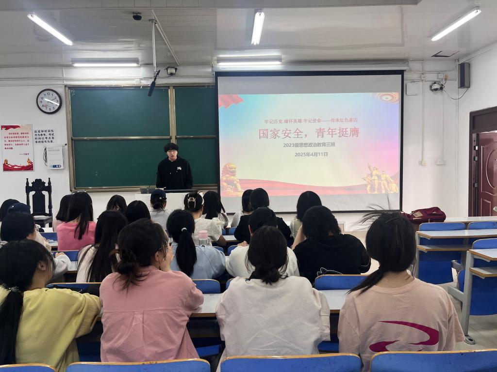 4月11日上午,金年会jinnianhuicom2023级思想政治教育三班在社科楼515召开“国家安全,青年挺膺”主题团课。金年会官网2023级思想政治教育三班全体同学共同参与本次团课,团课由团支书郝瀚主持。