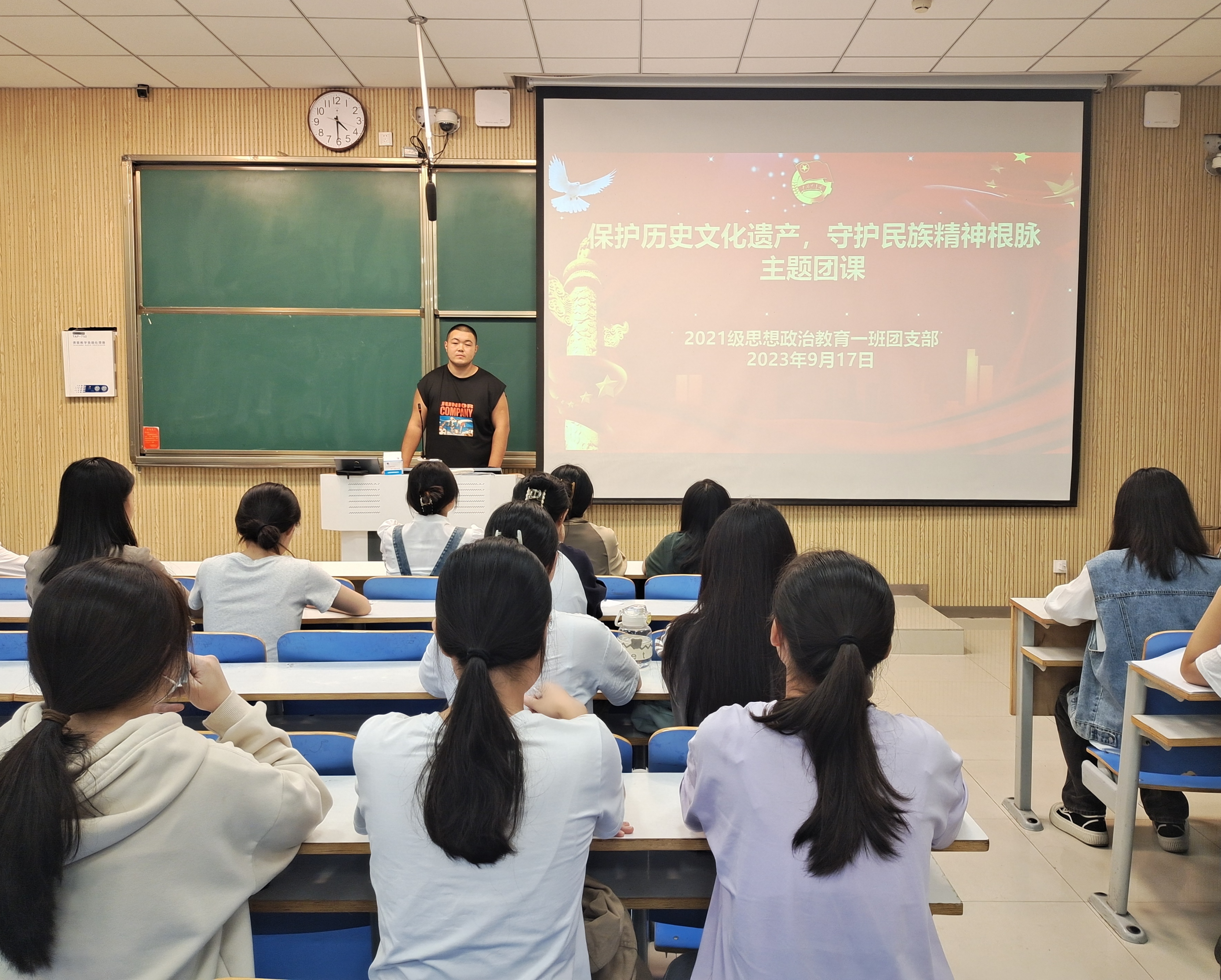 9月17日下午,金年会jinnianhuicom2021级思想政治教育一班在社科楼515教室召开“保护历史文化遗产,守护民族精神根脉”主题团课。2021级思想政治教育一班全体团员共同参加本次团课。团课由团支书戴翰林主持。