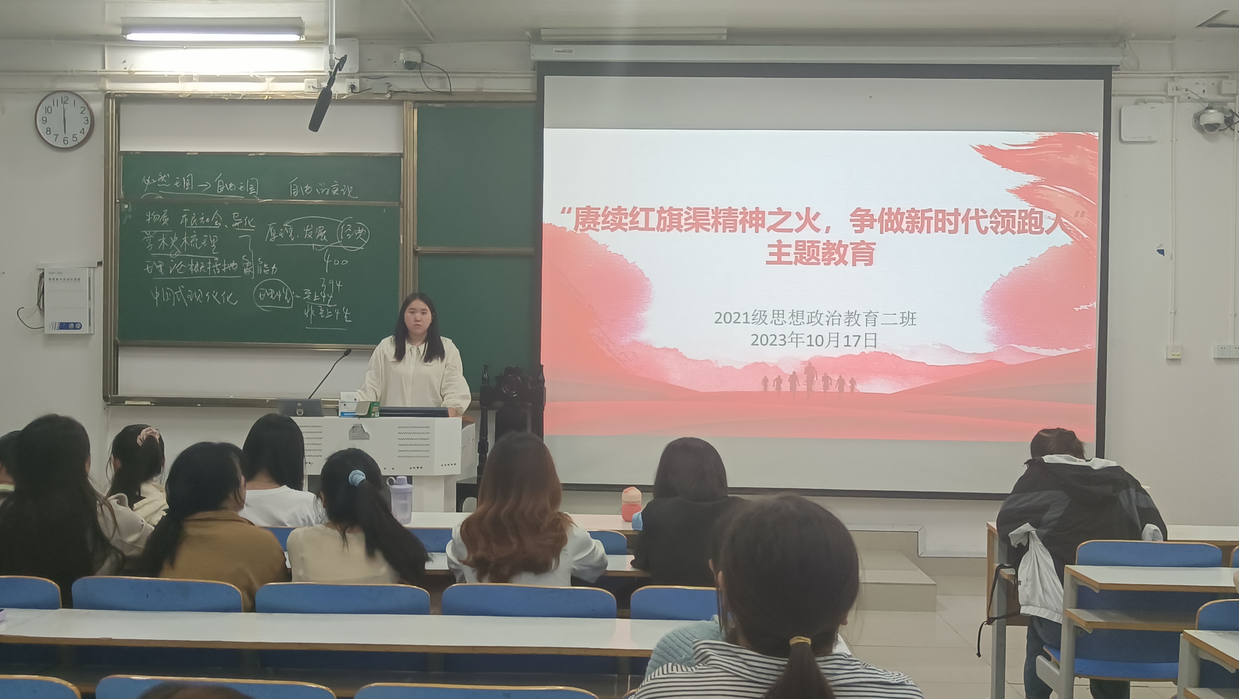 10月17日下午,金年会jinnianhuicom2021级思想政治教育二班在社科楼514教室召开“赓续红旗渠精神之火,争做新时代领跑人”主题团课。2021级思想政治教育二班全体团员参加此次团课。团课由团支书王婧欣主持。