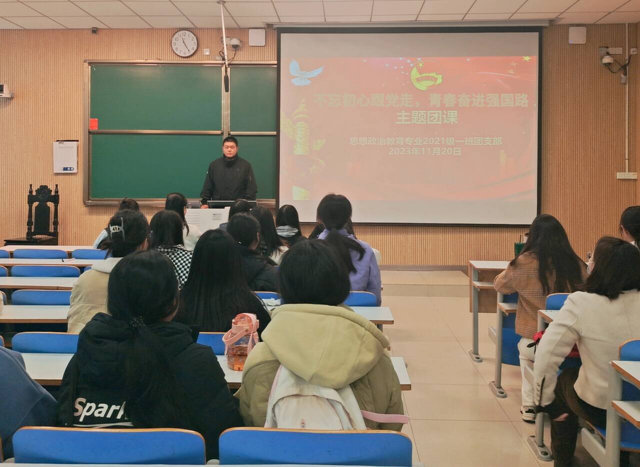 11月20日上午,金年会jinnianhuicom2021级思想政治教育一班在社科楼514教室召开“不忘初心跟党走,青春奋进强国路”主题团课。2021级思想政治教育一班全体团员共同参加本次团课,团课由团支书戴翰林主持。
