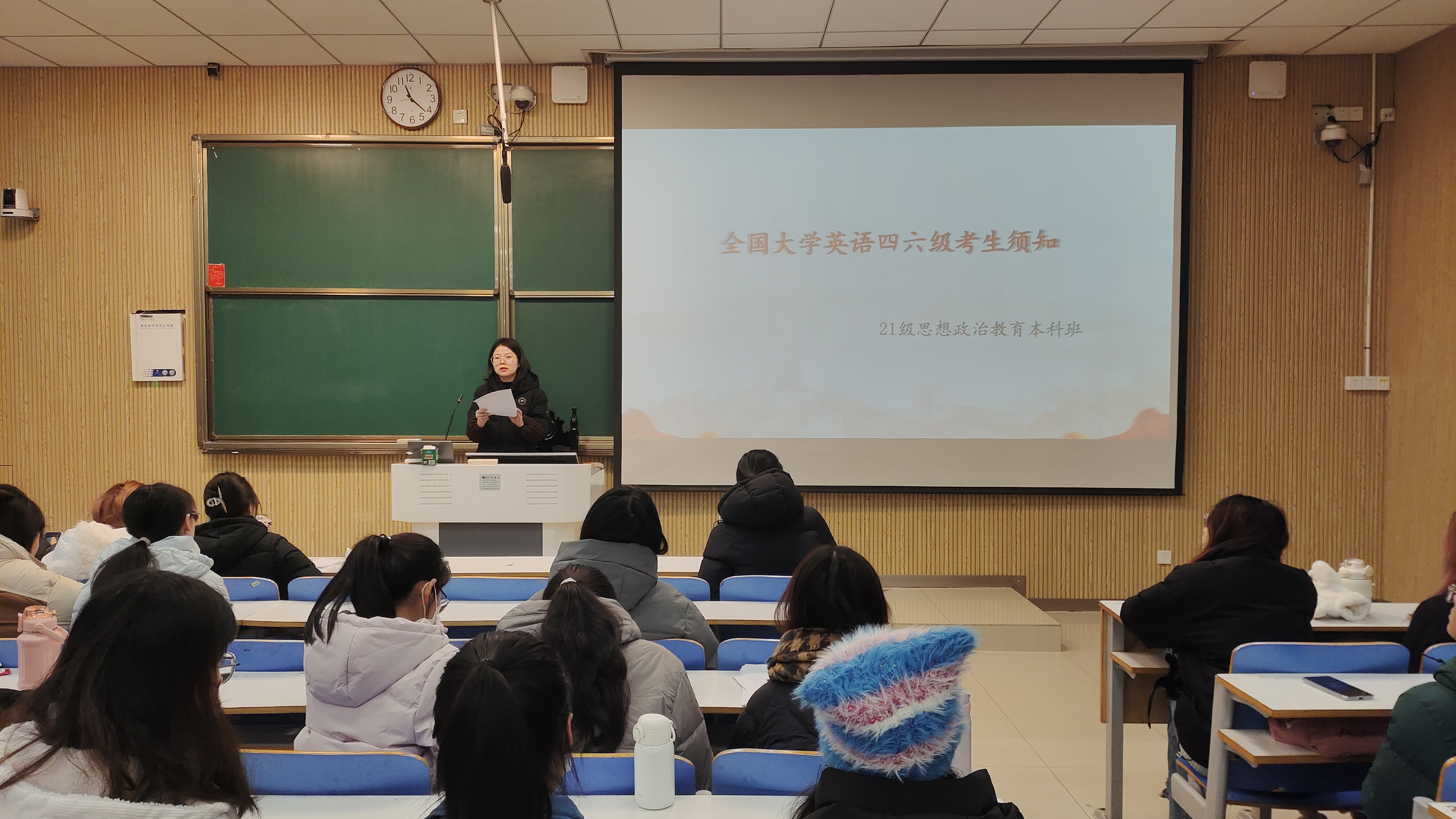 12月14日上午,金年会jinnianhuicom2021级思想政治教育全体成员在社科楼514教室召开“全国大学英语四六级考生须知”班会。辅导员高小佳及2021级思想政治教育一班、二班全体成员参加本次班会。班会由辅导员高小佳主持。