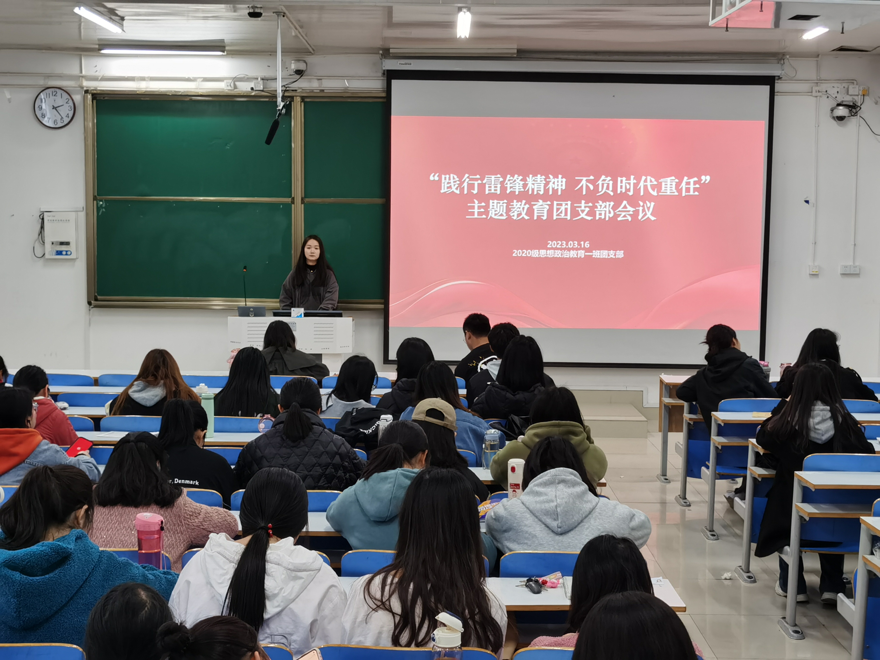 为贯彻落实习近平总书记关于学习雷锋精神和开展志愿服务工作的重要指示精神,加强团支部同学的思想品德教育,3月16日下午,金年会jinnianhuicom2020思想政治教育一班在社科楼514教室开展“践行雷锋精神,不负时代重任“主题团课。2020级思想政治教育一班全体团员参加此次团课。团课由团支部书记卢茜雨主持。