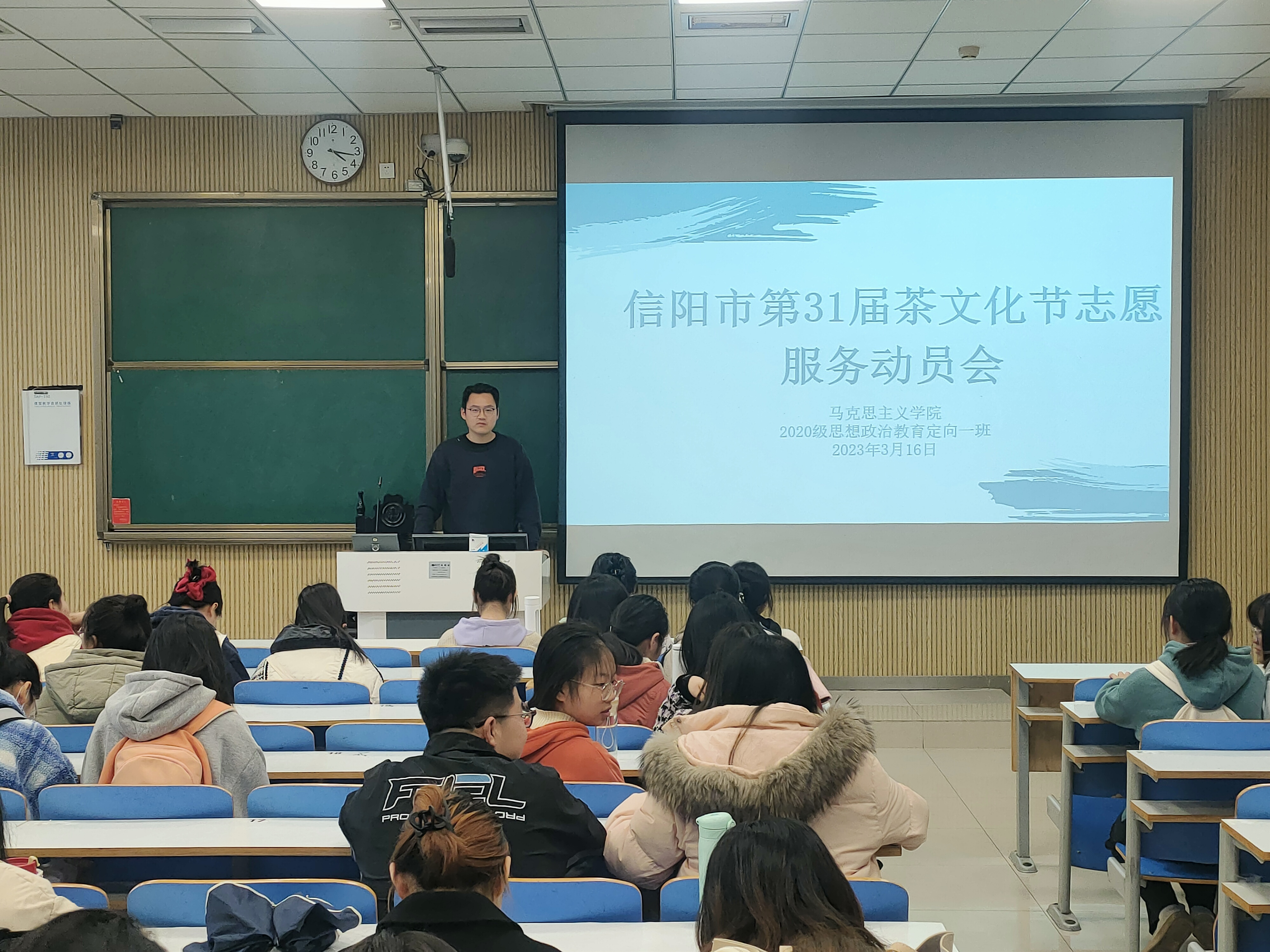 3月16日上午,金年会jinnianhuicom2020级思想政治教育定向一班在社科楼515教室顺利举行了信阳市第31届茶文化节志愿服务动员会。此次班会由团支书朱紫峰主持。