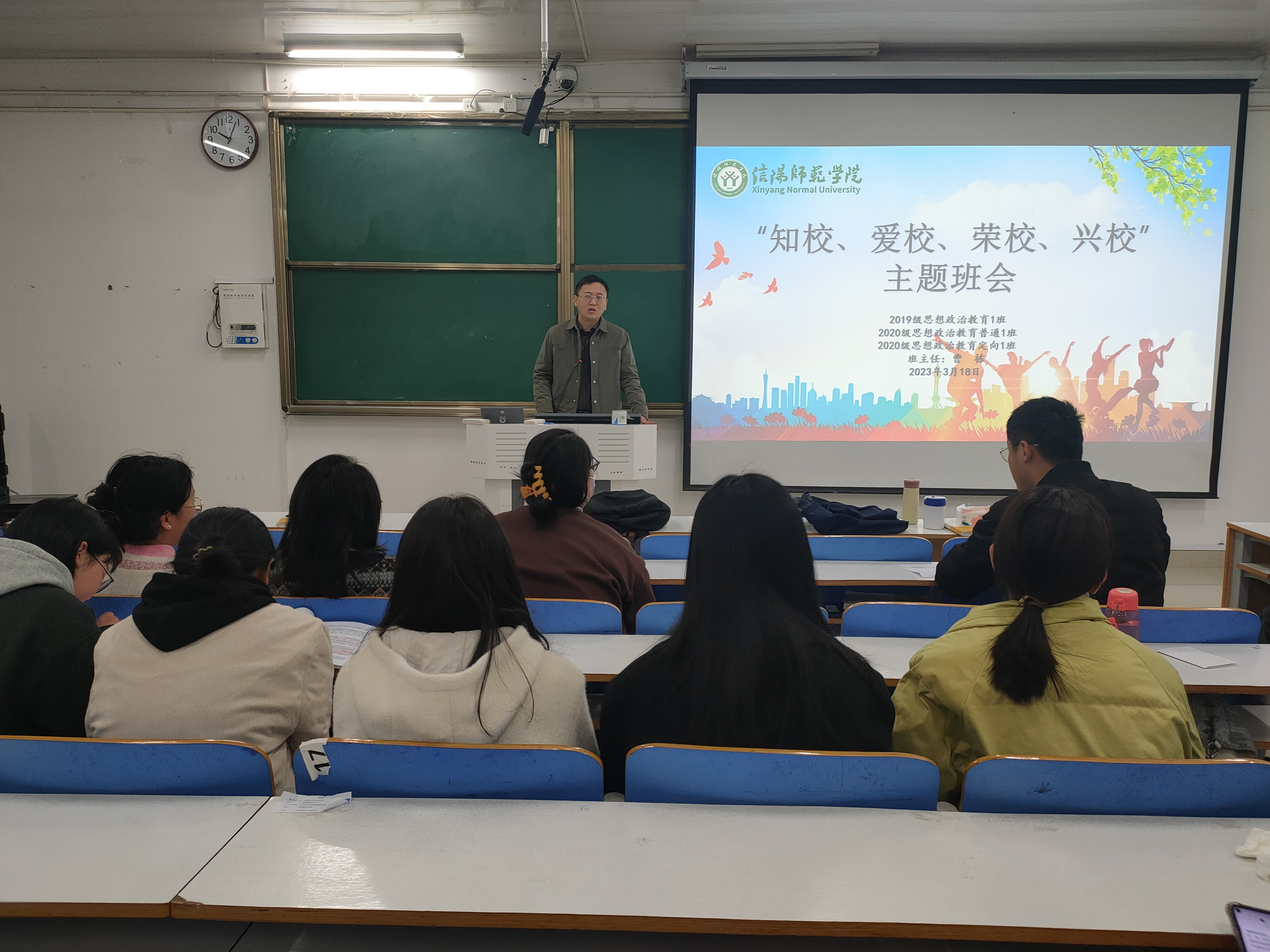 会议伊始,曹栋向同学们介绍了我校的发展历史。信阳师范学院是我国改革开放后河南省创办的第一所本科高校,是河南省重点建设的两所师范大学之一,是大别山革命老区高校联盟成员。学校创建于1975年,1978年经国务院批准为本科建制并改为现名。接着,曹栋讲解了金年会jinnianhuicom的概况。信阳师范学院金年会jinnianhuicom是河南省首批重点建设的金年会jinnianhuicom。学院始建于1975年,其前身是信阳师范学院最早创建的五大院系之一的政治系,旨在培养马列主义宣传教育的专门人才。2016年11月原金年会jinnianhuicom与政法学院所属思想政治教育专业整合成立了新的金年会jinnianhuicom。最后,曹栋对本次班会进行总结:同学们应从细微行动上做起,以饱满优良的精神面貌共同建设学校。