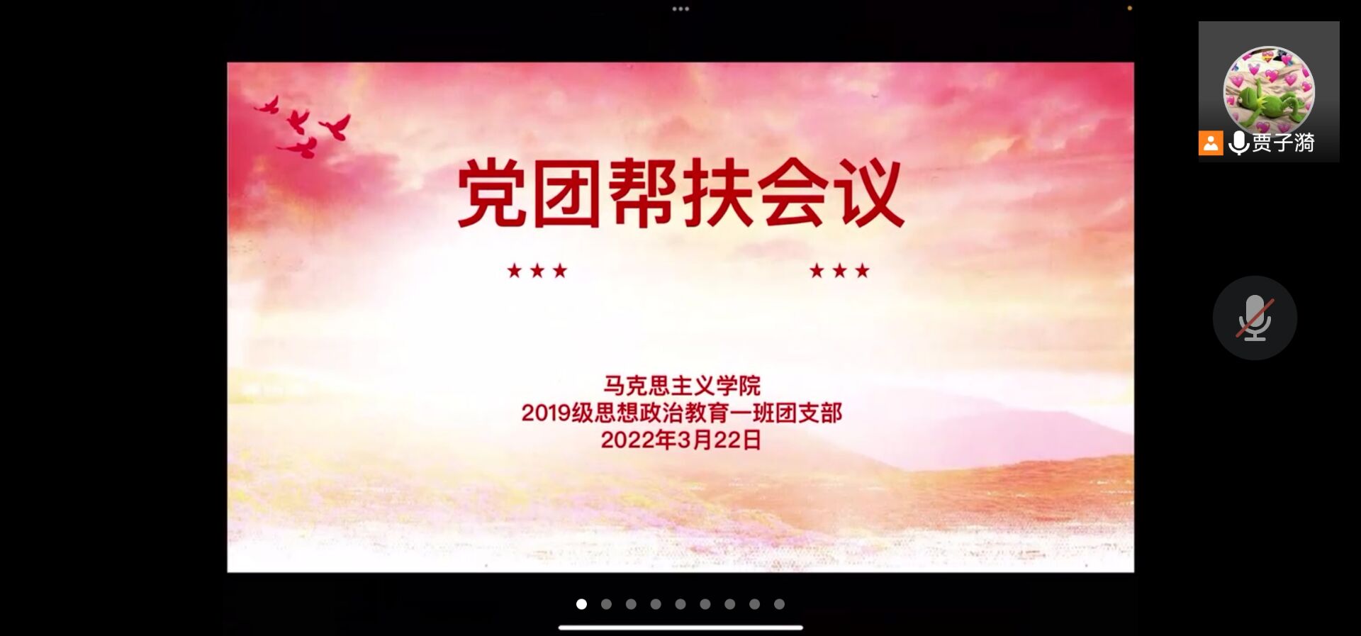 3月22日下午,金年会jinnianhuicom2019级思想政治教育一班第一团支部在腾讯会议召开“党团携手·党团帮扶会”。金年会jinnianhuicom2019级思想政治教育一班群体成员参加本次会议,会议由支书贾子漪主持。