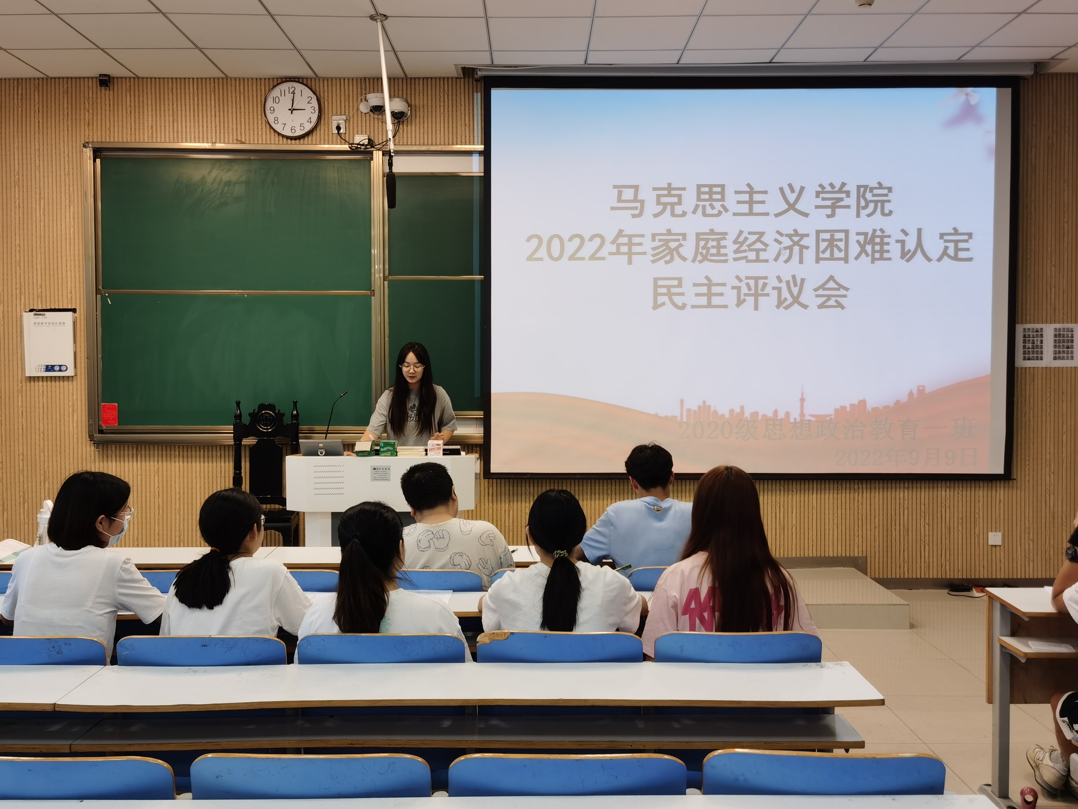 为做好家庭经济困难学生的认定工作,9月9日下午,金年会jinnianhuicom2020级思想政治教育一班在社科楼515教室召开2022年班级贫困认定民主评议会。评议小组成员、申请人及监督人参与了本次会议。会议由团支书卢茜雨主持。