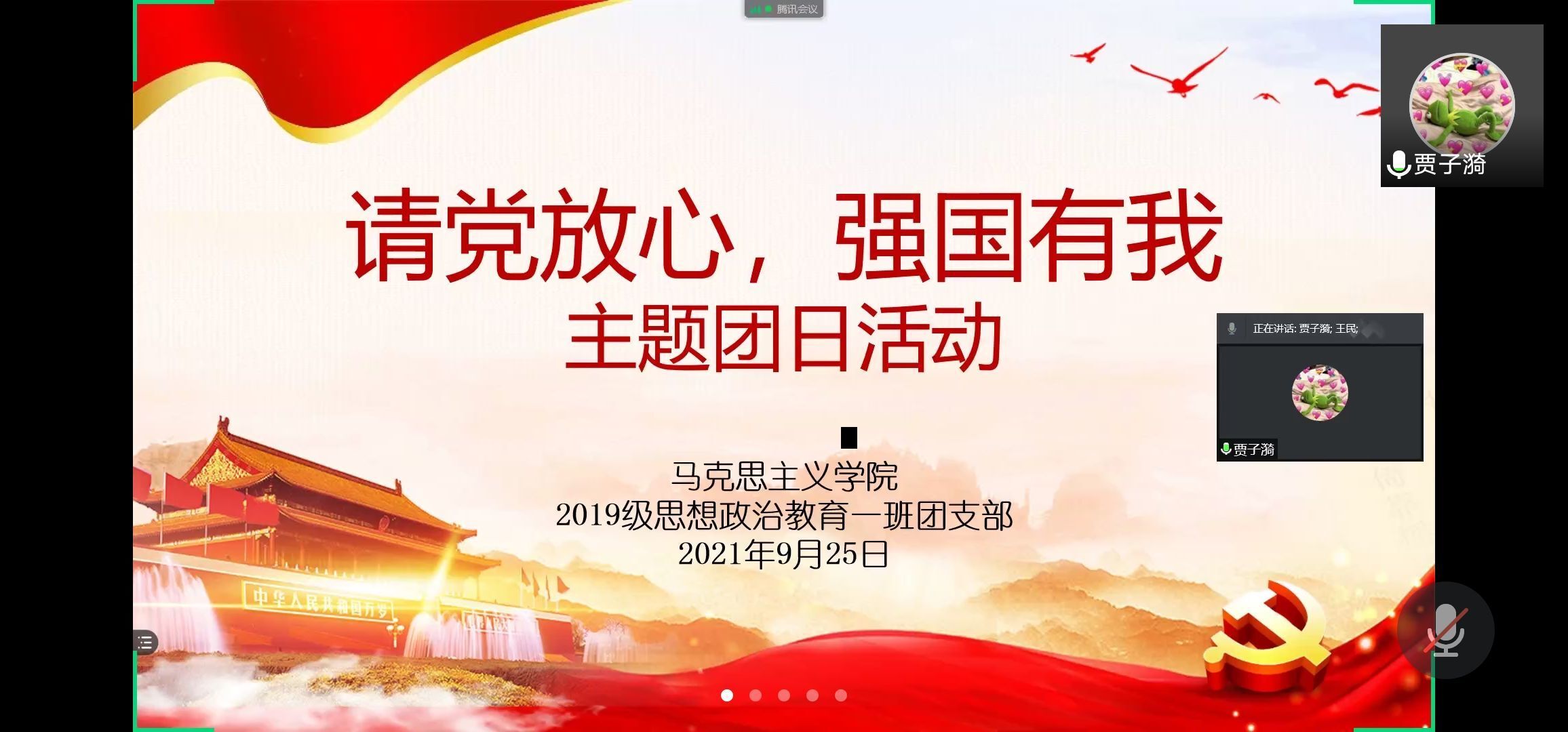 9月25日下午,金年会jinnianhuicom2019级思想政治教育一班第一团支部在腾讯视频举办“请党放心,强国有我”主题团日活动。金年会jinnianhuicom2019级思想政治教育一班全体团员参加本次活动。活动由团支书贾子漪主持。