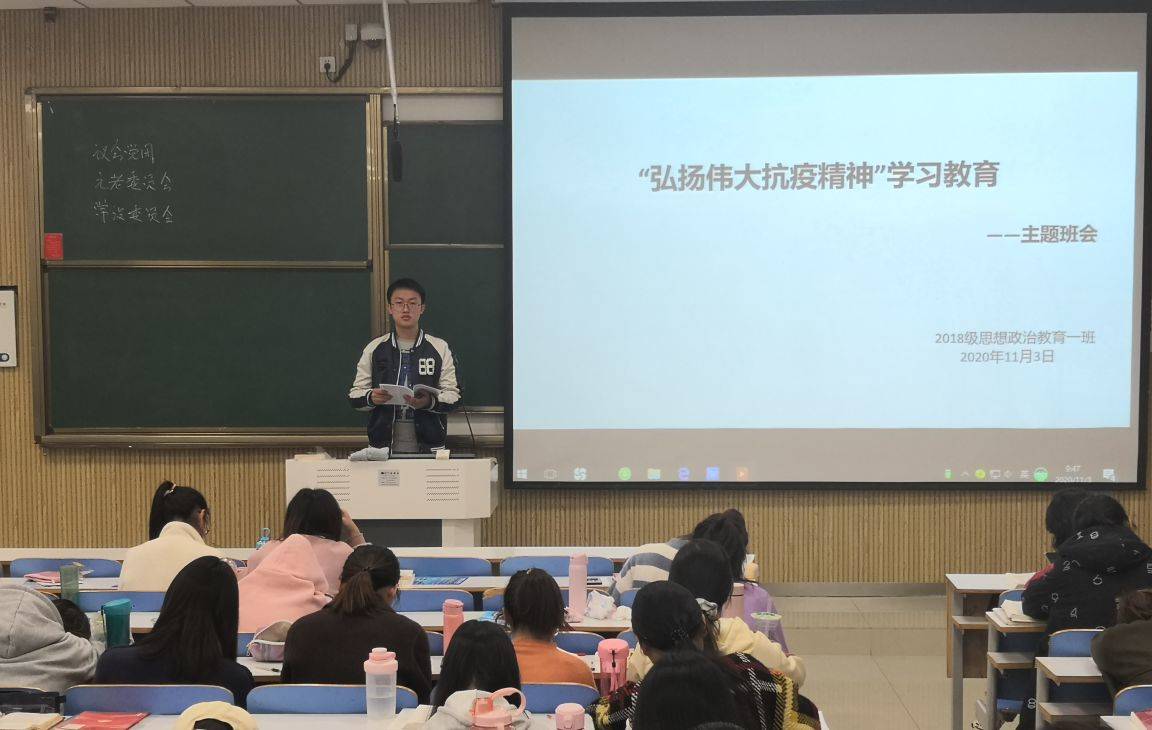 11月3日上午,金年会jinnianhuicom2018级思想政治教育一班在社科楼515教室顺利开展“弘扬伟大抗疫精神”主题班会。2018级思想政治教育一班全体同学共同参加此次会议。会议由班长邢子豪主持。
