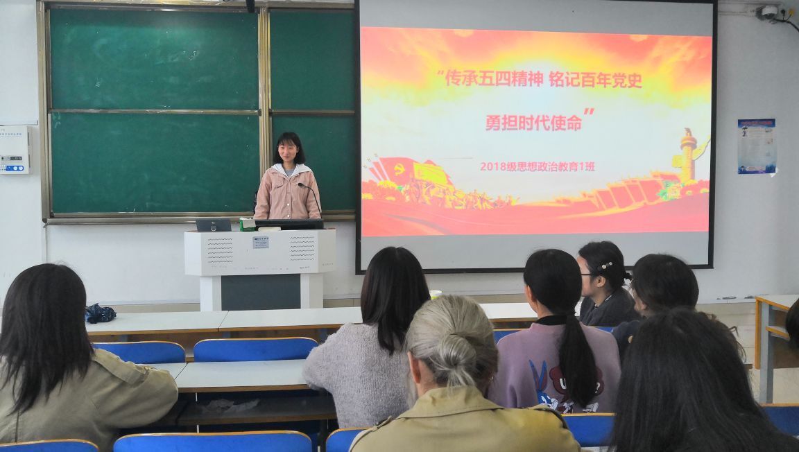 知史爱党,知史爱国,4月25日上午,2018级思想政治教育一班在社科楼514教室顺利开展“传承五四精神,铭记百年党史”团支部大会。2018级思想政治教育一班全体同学共同参加了此次会议。会议由团支书靳雨露主持。