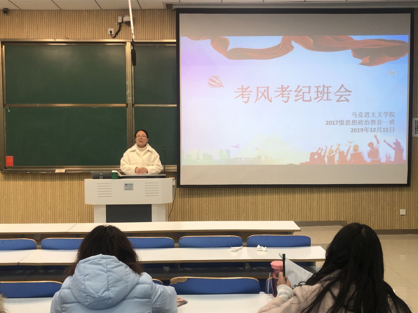 为加强班级学风建设,严明考纪, 12月10日上午,2017级思想政治教育一班在社科楼515教室开展了考风考纪主题班会,辅导员曹菁菁及全体同学共同参与。