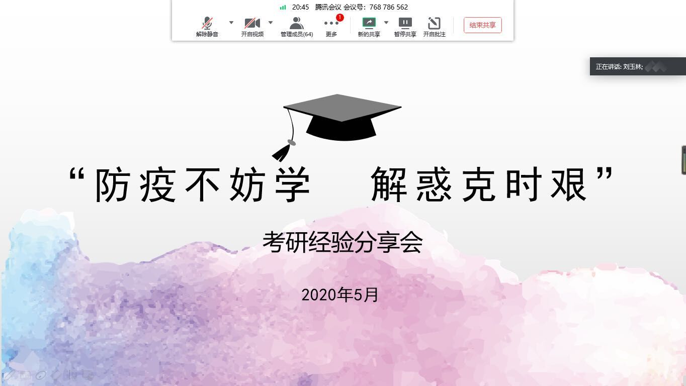 会上,三位学姐结合班级收集的备考疑惑,有的放矢地传授相关经验。刘玉林从专业课资料查找、提高复习效率两方面为切入点传授经验;张雅琼从英语、政治、专业课的资料查找与运用、备考感受、时间分配三方面分享自己的备考秘诀;吴晨晨结合自身经历为同学们提供选择报考学校及笔试答题的技巧。随后,问答环节中,各位同学积极踊跃在腾讯会议聊天框诉说备考疑惑。三位分享者条理清晰,层次明确,毫无保留地进行语音解答,提供有效帮助。