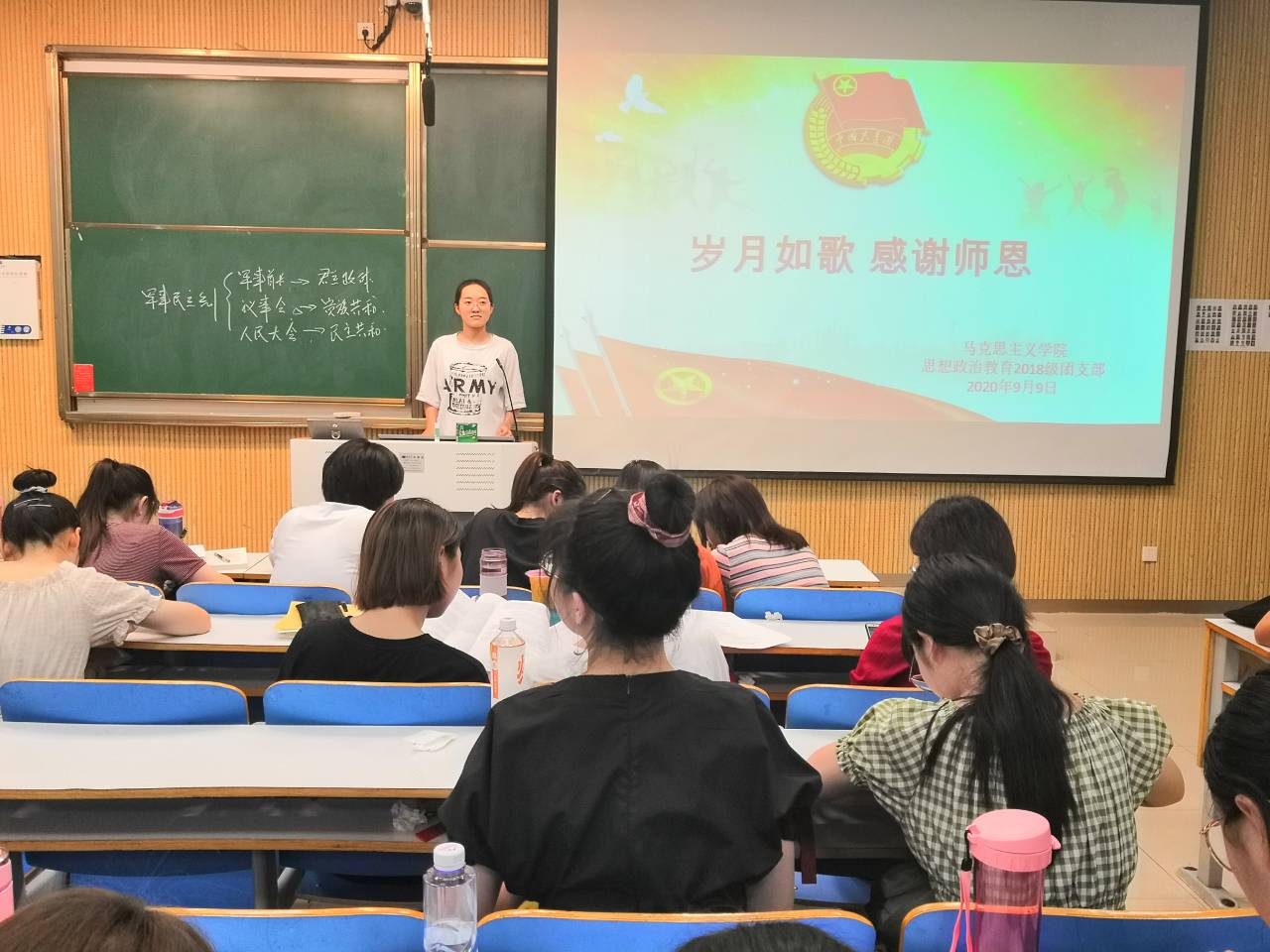 9月8日上午,金年会jinnianhuicom2018级思想政治教育团支部在社科楼515教室顺利开展“岁月如歌,感谢师恩”主题团会。2018级全体学生共同参加此次会议。会议由第二团支部书记黄子晋主持。